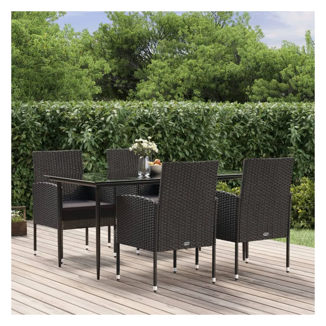 Profitez d'un bon repas ou d'un thé l'après-midi dans votre espace extérieur avec cet ensemble de salle à manger de jardin ! Matériau résistant aux intempéries : la résine tressée, également connue sous le nom de rotin poly, résiste aux intempéries et est facile à nettoyer. Elle reste belle à l'extérieur pendant une longue période. Elle offre une excellente qualité, commodité et un aspect esthétique.Cadre robuste : les cadres en acier enduit de poudre rendent l'ensemble de salle à manger d'extérieur robuste et stable pour une utilisation quotidienne à l'extérieur.Dessus de table pratique : le dessus lisse de la table de salle à manger est en verre trempé, facile à nettoyer avec un chiffon humide. De plus, le dessus robuste est parfait pour placer des repas, des boissons et d'autres objets décoratifs.Design confortable : conçues avec des dossiers et des accoudoirs incurvés, ces chaises d'extérieur offrent un maximum de confort.Confort supplémentaire : les coussins bien rembourrés offrent un confort ultime pendant votre temps d'assise. Remarque :Afin de prolonger la durée de vie de votre mobilier d'extérieur, nous vous recommandons de le protéger avec une housse imperméable.Chaque produit est livré avec un manuel de montage dans la boîte pour un montage facile.