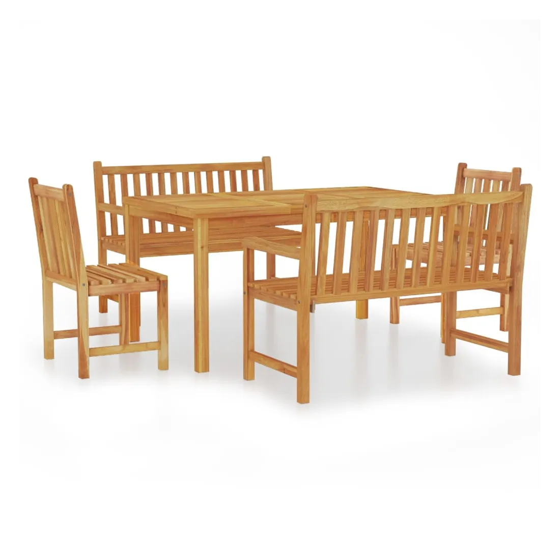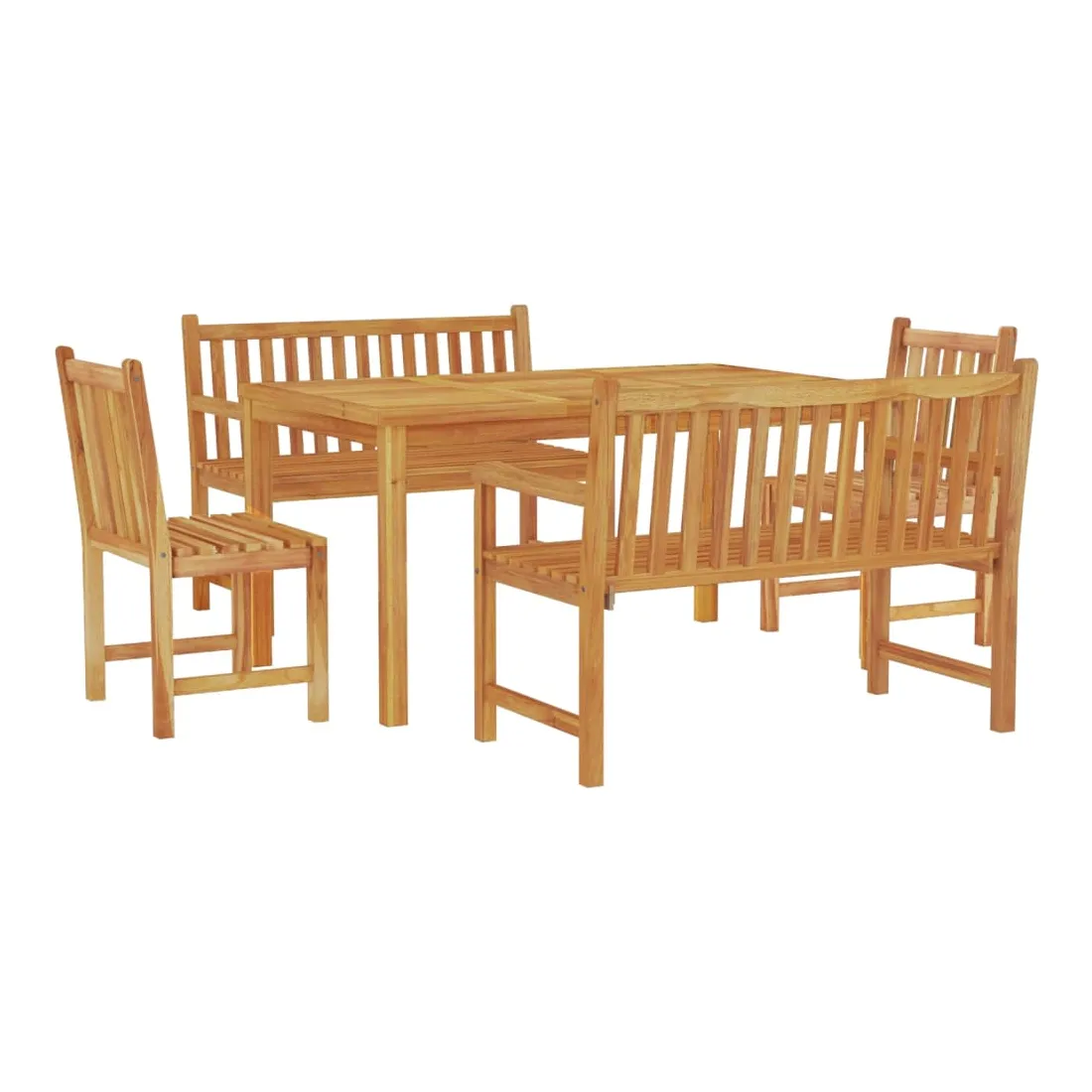 Cet ensemble de salle à manger de jardin en bois, au design élégant et contemporain, est un excellent choix pour manger ou vous détendre dans le jardin. Bois de teck massif : le bois de teck massif est un matériau naturel magnifique. Il a été chevronné, séché au four, puis sablé finement pour lui donner une apparence très lisse. Le bois de teck est connu pour sa résistance exceptionnelle et sa résistance aux intempéries.Dessus de table robuste : cette table de repas vous offre un dessus de table robuste. Vous pouvez y placer vos collations, tes boissons et toutes vos décorations préférées.Caractéristique résistante à l'eau : grâce à sa caractéristique de résistance à l'eau et à son look classique, vous pouvez placer l'ensemble de meubles de jardin n'importe où autour de votre maison, que ce soit à l'intérieur ou à l'extérieur !Expérience d'assise confortable : chaque banc et chaise de dîner est doté d'un dossier, ce qui rend l'assise très confortable. Remarque :Chaque produit est livré avec un manuel de montage dans la boîte pour un montage facile.Afin de prolonger la durée de vie de votre mobilier d'extérieur, nous vous recommandons de le protéger avec une housse imperméable.