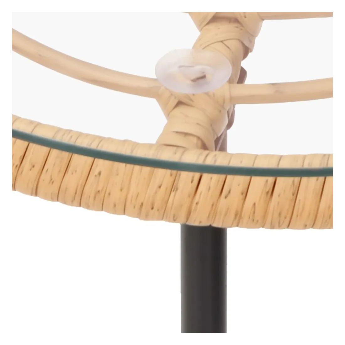 - Matériau : acier, verre trempé, polyéthylène avec un aspect de rotin