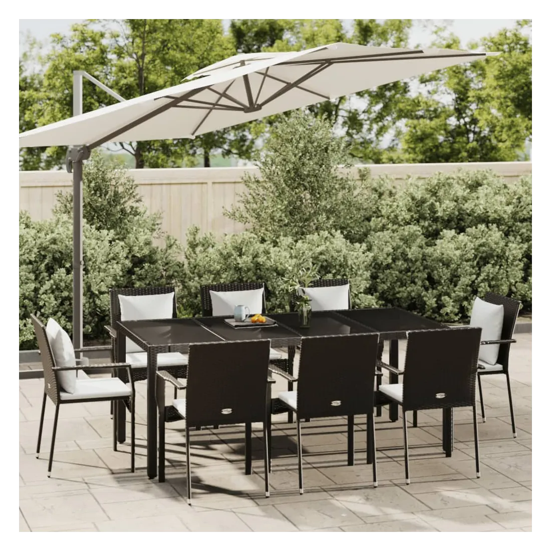 Cet ensemble de salle à manger de jardin tendance, au design élégant et contemporain, est un excellent choix pour manger ou vous détendre dans votre jardin. Matériau résistant aux intempéries : la résine tressée, également connue sous le nom de rotin poly, résiste aux intempéries et est facile à nettoyer. Elle reste belle à l'extérieur pendant une longue période. Elle offre une excellente qualité, commodité et un aspect esthétique.Cadre robuste : les cadres en acier enduit de poudre rendent l'ensemble de salle à manger d'extérieur robuste et stable pour une utilisation quotidienne à l'extérieur.Dessus de table pratique : le dessus lisse de la table de jardin est en verre trempé, facile à nettoyer avec un chiffon humide. De plus, le dessus robuste est parfait pour placer des repas, des boissons et d'autres objets décoratifs.Conception modulaire : l'ensemble de salle à manger de jardin est flexible et facile à déplacer, vous pouvez donc le combiner avec d'autres segments modulaires dans la boutique en ligne pour créer vos propres configurations d'ensemble de salle à manger de jardin !Expérience d'assise confortable : le dossier ajoute un confort d'assise supplémentaire à la chaise de jardin. De plus, les coussins bien rembourrés vous permettent de vous asseoir confortablement. Bon à savoir :Pour faciliter au maximum le montage, chaque produit est livré avec des instructions. Remarque :Pour que vos meubles d'extérieur restent beaux, nous vous recommandons de les protéger avec une housse imperméable.