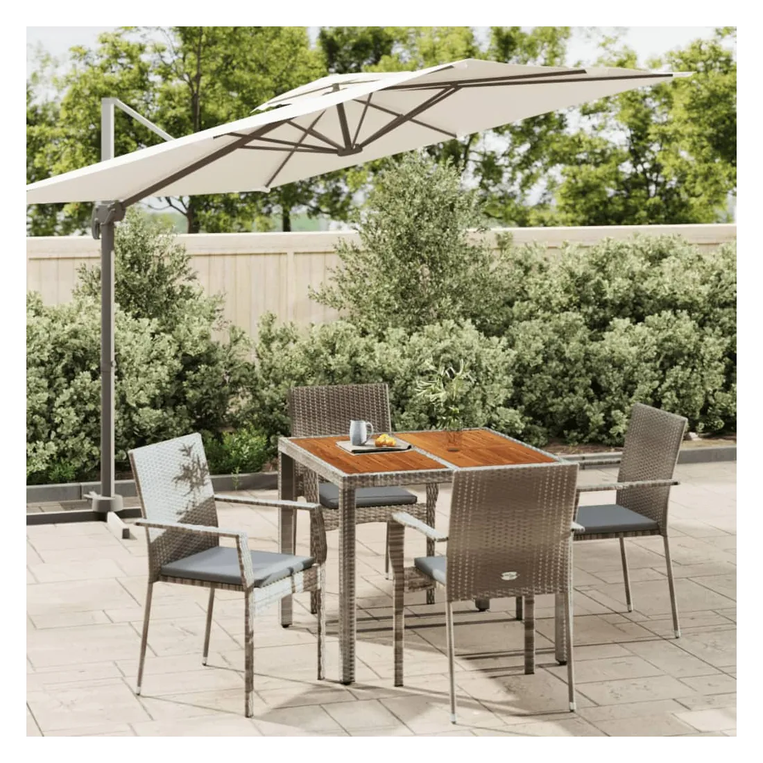 vidaXLCet ensemble de salle à manger de jardin tendance, au design élégant et contemporain, est un excellent choix pour manger ou vous détendre dans votre jardin. Matériau résistant aux intempéries : la résine tressée, également connue sous le nom de rotin poly, résiste aux intempéries et est facile à nettoyer. Elle reste belle à l'extérieur pendant une longue période. Elle offre une excellente qualité, commodité et un aspect esthétique.Cadre robuste : les cadres en acier enduit de poudre rendent l'ensemble de salle à manger d'extérieur robuste et stable pour une utilisation quotidienne à l'extérieur.Dessus de table pratique : le dessus de table en bois d'acacia massif est parfait pour placer des boissons, des aliments et des décorations. Il a une belle apparence et est facile à nettoyer.Conception modulaire : l'ensemble de salle à manger de jardin est flexible et facile à déplacer, vous pouvez donc le combiner avec d'autres segments modulaires dans la boutique en ligne pour créer vos propres configurations d'ensemble de salle à manger de jardin !Expérience d'assise confortable : le dossier ajoute un confort d'assise supplémentaire à la chaise de jardin. De plus, les coussins bien rembourrés vous permettent de vous asseoir confortablement. Bon à savoir :Pour faciliter au maximum le montage, chaque produit est livré avec des instructions. Remarque :Pour que vos meubles d'extérieur restent beaux, nous vous recommandons de les protéger avec une housse imperméable.