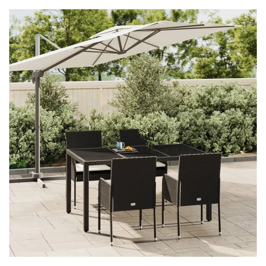 Cet ensemble de salle à manger de jardin tendance, au design élégant et contemporain, est un excellent choix pour manger ou vous détendre dans votre jardin. Matériau résistant aux intempéries : la résine tressée, également connue sous le nom de rotin poly, résiste aux intempéries et est facile à nettoyer. Elle reste belle à l'extérieur pendant une longue période. Elle offre une excellente qualité, commodité et un aspect esthétique.Cadre robuste : les cadres en acier enduit de poudre rendent l'ensemble de salle à manger d'extérieur robuste et stable pour une utilisation quotidienne à l'extérieur.Dessus de table pratique : le dessus lisse de la table de jardin est en verre trempé, facile à nettoyer avec un chiffon humide. De plus, le dessus robuste est parfait pour placer des repas, des boissons et d'autres objets décoratifs.Conception modulaire : l'ensemble de salle à manger de jardin est flexible et facile à déplacer, vous pouvez donc le combiner avec d'autres segments modulaires dans la boutique en ligne pour créer vos propres configurations d'ensemble de salle à manger de jardin !Expérience d'assise confortable : le dossier ajoute un confort d'assise supplémentaire à la chaise de jardin. De plus, les coussins bien rembourrés vous permettent de vous asseoir confortablement. Bon à savoir :Pour faciliter au maximum le montage, chaque produit est livré avec des instructions. Remarque :Pour que vos meubles d'extérieur restent beaux, nous vous recommandons de les protéger avec une housse imperméable.