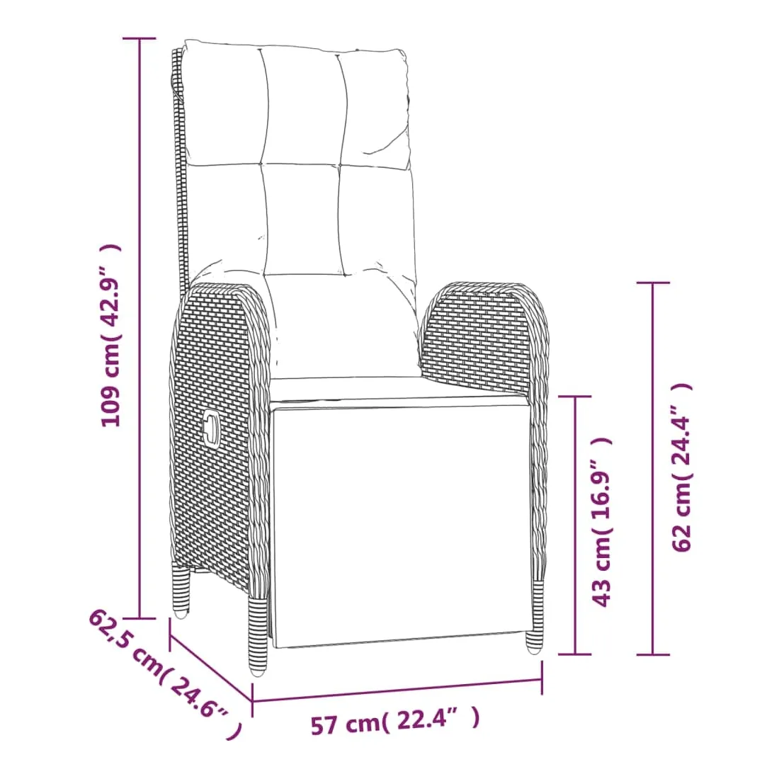 vidaXLCet ensemble de salle à manger de jardin tendance, au design élégant et contemporain, est un excellent choix pour manger ou vous détendre dans votre jardin. Matériau résistant aux intempéries : la résine tressée, également connue sous le nom de rotin poly, résiste aux intempéries et est facile à nettoyer. Elle reste belle à l'extérieur pendant une longue période. Elle offre une excellente qualité, commodité et un aspect esthétique.Cadre robuste : les cadres en acier enduit de poudre rendent l'ensemble de salle à manger d'extérieur robuste et stable pour une utilisation quotidienne à l'extérieur.Dessus de table pratique : le dessus lisse de la table de jardin est en verre trempé, facile à nettoyer avec un chiffon humide. De plus, le dessus robuste est parfait pour placer des repas, des boissons et d'autres objets décoratifs.Fonction d'inclinaison : les chaises de jardin sont spécialement conçues avec une fonction d'inclinaison afin que vous puissiez régler le dossier selon votre confort.Expérience d'assise confortable : le dossier ajoute un confort d'assise supplémentaire à la chaise de jardin. De plus, les coussins bien rembourrés vous permettent de vous asseoir confortablement. Bon à savoir :Pour faciliter au maximum le montage, chaque produit est livré avec des instructions. Remarque :Pour que vos meubles d'extérieur restent beaux, nous vous recommandons de les protéger avec une housse imperméable.