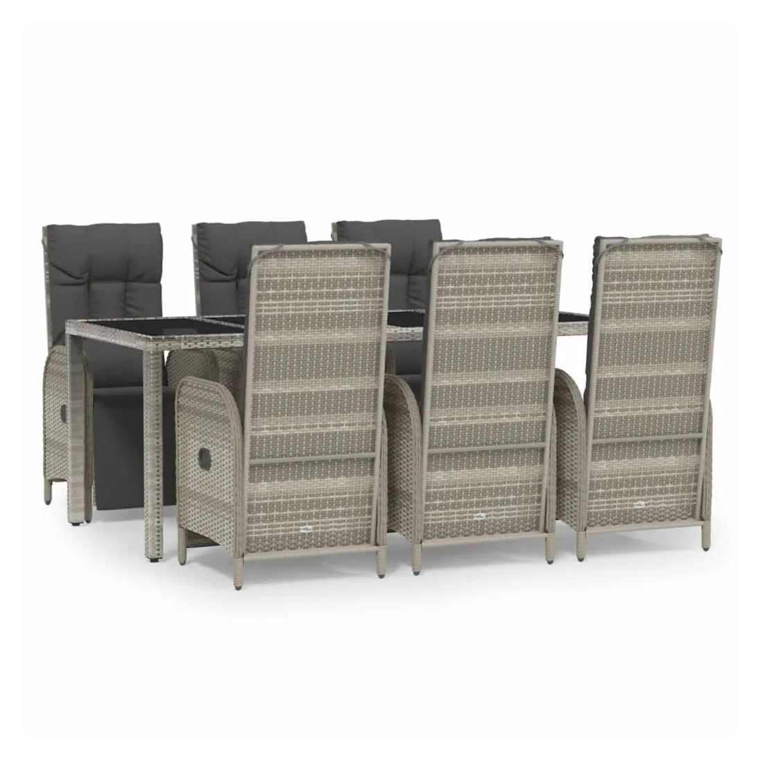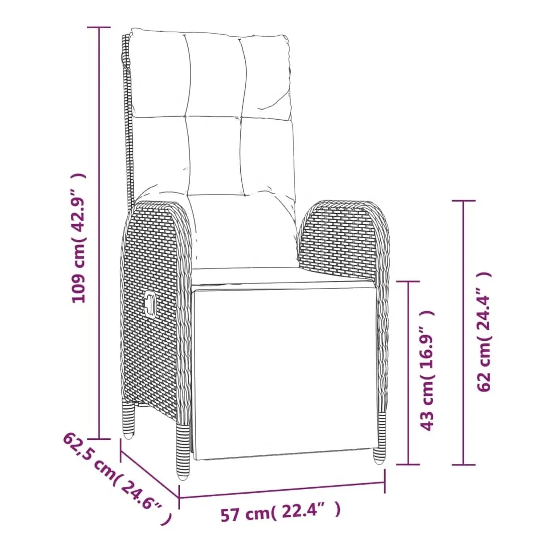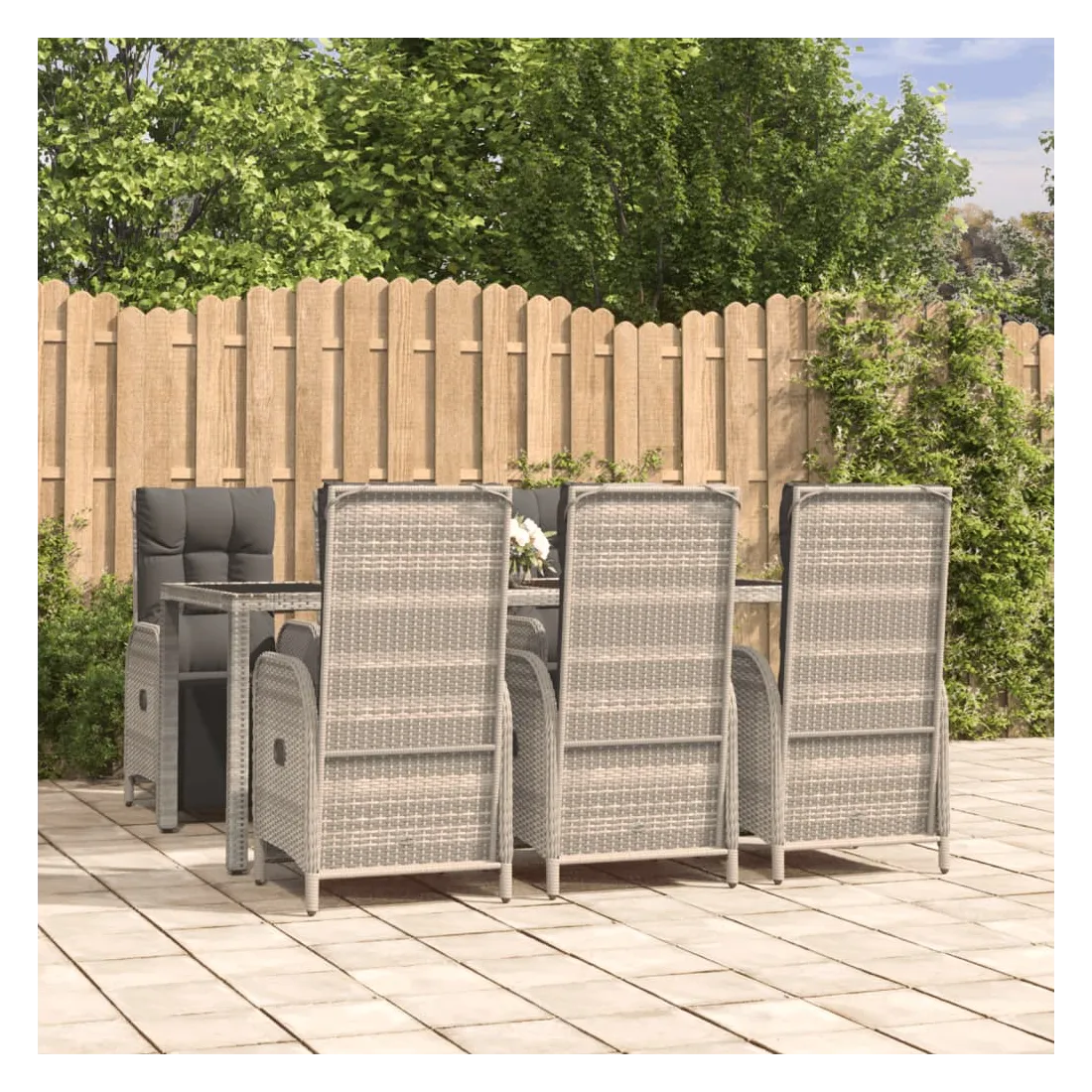 Cet ensemble de salle à manger de jardin tendance, au design élégant et contemporain, est un excellent choix pour manger ou vous détendre dans votre jardin. Matériau résistant aux intempéries : la résine tressée, également connue sous le nom de rotin poly, résiste aux intempéries et est facile à nettoyer. Elle reste belle à l'extérieur pendant une longue période. Elle offre une excellente qualité, commodité et un aspect esthétique.Cadre robuste : les cadres en acier enduit de poudre rendent l'ensemble de salle à manger d'extérieur robuste et stable pour une utilisation quotidienne à l'extérieur.Dessus de table pratique : le dessus lisse de la table de jardin est en verre trempé, facile à nettoyer avec un chiffon humide. De plus, le dessus robuste est parfait pour placer des repas, des boissons et d'autres objets décoratifs.Fonction d'inclinaison : les chaises de jardin sont spécialement conçues avec une fonction d'inclinaison afin que vous puissiez régler le dossier selon votre confort.Expérience d'assise confortable : le dossier ajoute un confort d'assise supplémentaire à la chaise de jardin. De plus, les coussins bien rembourrés vous permettent de vous asseoir confortablement. Bon à savoir :Pour faciliter au maximum le montage, chaque produit est livré avec des instructions. Remarque :Pour que vos meubles d'extérieur restent beaux, nous vous recommandons de les protéger avec une housse imperméable.