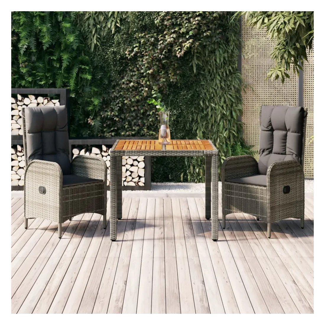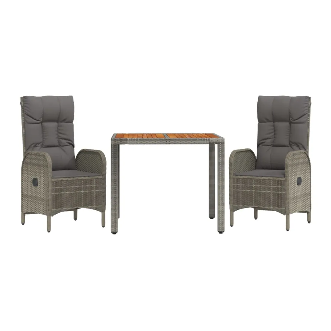 vidaXLCet ensemble de salle à manger de jardin tendance, au design élégant et contemporain, est un excellent choix pour manger ou vous détendre dans votre jardin. Matériau résistant aux intempéries : la résine tressée, également connue sous le nom de rotin poly, résiste aux intempéries et est facile à nettoyer. Elle reste belle à l'extérieur pendant une longue période. Elle offre une excellente qualité, commodité et un aspect esthétique.Cadre robuste : les cadres en acier enduit de poudre rendent l'ensemble de salle à manger d'extérieur robuste et stable pour une utilisation quotidienne à l'extérieur.Dessus de table pratique : le dessus de table en bois d'acacia massif est parfait pour placer des boissons, des aliments et des décorations. Il a une belle apparence et est facile à nettoyer.Fonction d'inclinaison : les chaises de jardin sont spécialement conçues avec une fonction d'inclinaison afin que vous puissiez régler le dossier selon votre confort.Expérience d'assise confortable : le dossier ajoute un confort d'assise supplémentaire à la chaise de jardin. De plus, les coussins bien rembourrés vous permettent de vous asseoir confortablement. Bon à savoir :Pour faciliter au maximum le montage, chaque produit est livré avec des instructions. Remarque :Pour que vos meubles d'extérieur restent beaux, nous vous recommandons de les protéger avec une housse imperméable.