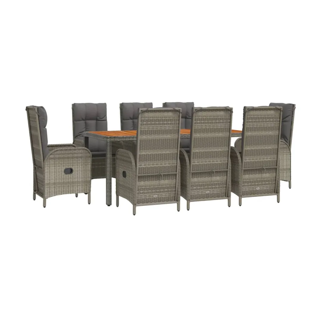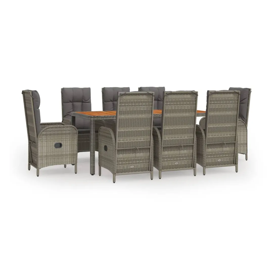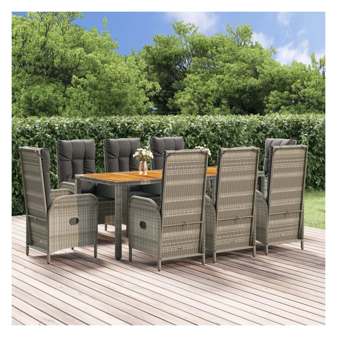 Cet ensemble de salle à manger de jardin tendance, au design élégant et contemporain, est un excellent choix pour manger ou vous détendre dans votre jardin. Matériau résistant aux intempéries : la résine tressée, également connue sous le nom de rotin poly, résiste aux intempéries et est facile à nettoyer. Elle reste belle à l'extérieur pendant une longue période. Elle offre une excellente qualité, commodité et un aspect esthétique.Cadre robuste : les cadres en acier enduit de poudre rendent l'ensemble de salle à manger d'extérieur robuste et stable pour une utilisation quotidienne à l'extérieur.Dessus de table pratique : le dessus de table en bois d'acacia massif est parfait pour placer des boissons, des aliments et des décorations. Il a une belle apparence et est facile à nettoyer.Fonction d'inclinaison : les chaises de jardin sont spécialement conçues avec une fonction d'inclinaison afin que vous puissiez régler le dossier selon votre confort.Expérience d'assise confortable : le dossier ajoute un confort d'assise supplémentaire à la chaise de jardin. De plus, les coussins bien rembourrés vous permettent de vous asseoir confortablement. Bon à savoir :Pour faciliter au maximum le montage, chaque produit est livré avec des instructions. Remarque :Pour que vos meubles d'extérieur restent beaux, nous vous recommandons de les protéger avec une housse imperméable.