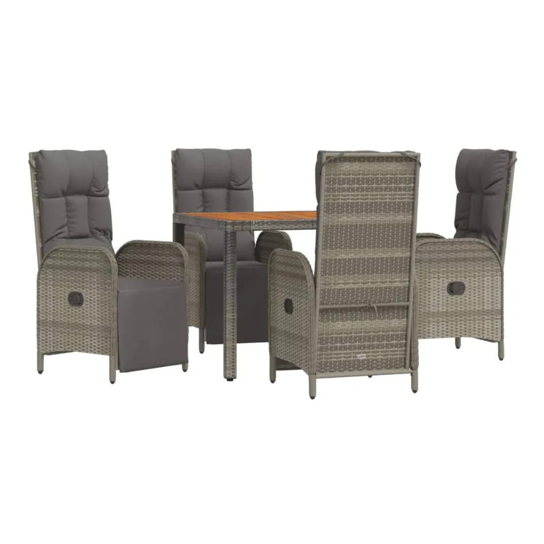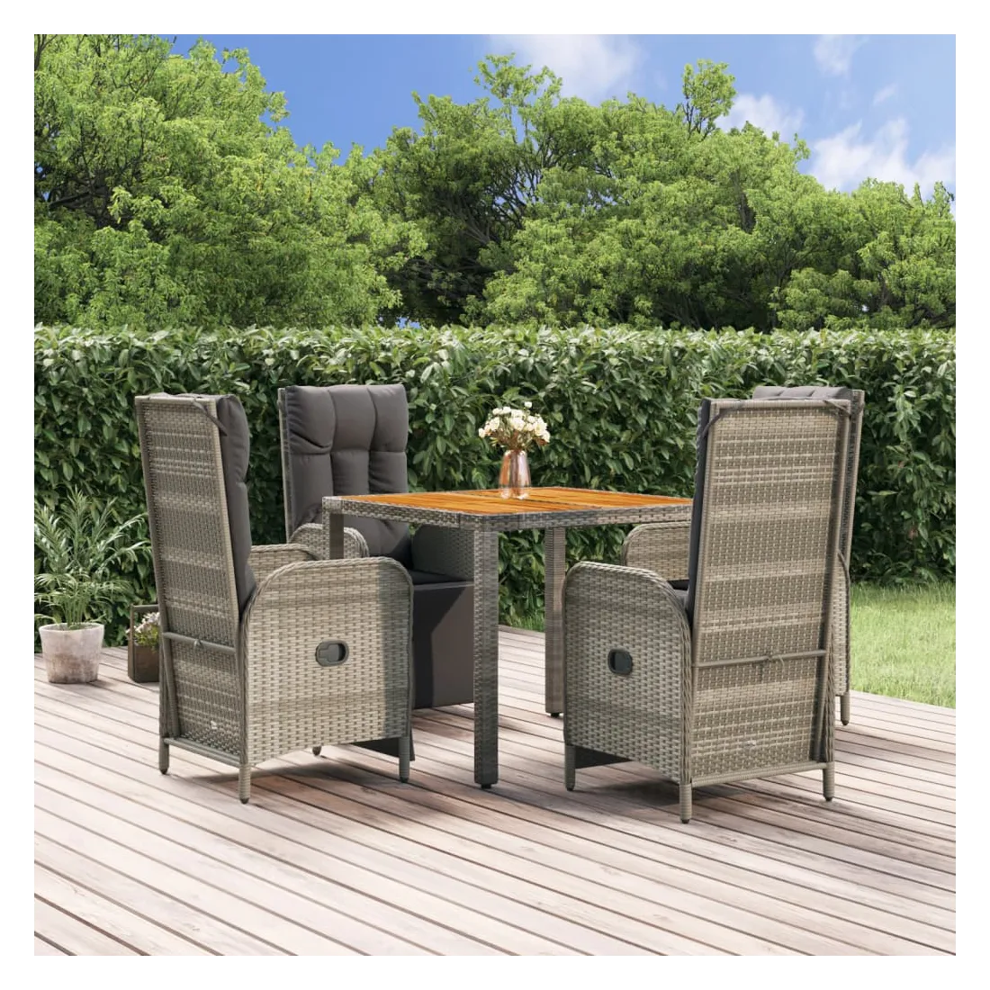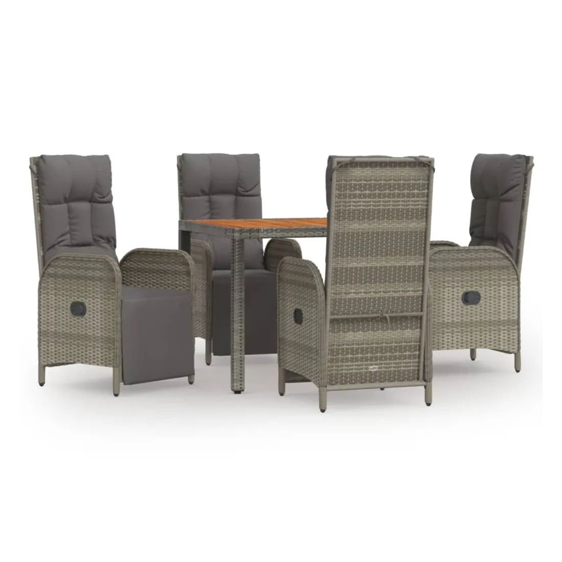 vidaXLCet ensemble de salle à manger de jardin tendance, au design élégant et contemporain, est un excellent choix pour manger ou vous détendre dans votre jardin. Matériau résistant aux intempéries : la résine tressée, également connue sous le nom de rotin poly, résiste aux intempéries et est facile à nettoyer. Elle reste belle à l'extérieur pendant une longue période. Elle offre une excellente qualité, commodité et un aspect esthétique.Cadre robuste : les cadres en acier enduit de poudre rendent l'ensemble de salle à manger d'extérieur robuste et stable pour une utilisation quotidienne à l'extérieur.Dessus de table pratique : le dessus de table en bois d'acacia massif est parfait pour placer des boissons, des aliments et des décorations. Il a une belle apparence et est facile à nettoyer.Fonction d'inclinaison : les chaises de jardin sont spécialement conçues avec une fonction d'inclinaison afin que vous puissiez régler le dossier selon votre confort.Expérience d'assise confortable : le dossier ajoute un confort d'assise supplémentaire à la chaise de jardin. De plus, les coussins bien rembourrés vous permettent de vous asseoir confortablement. Bon à savoir :Pour faciliter au maximum le montage, chaque produit est livré avec des instructions. Remarque :Pour que vos meubles d'extérieur restent beaux, nous vous recommandons de les protéger avec une housse imperméable.