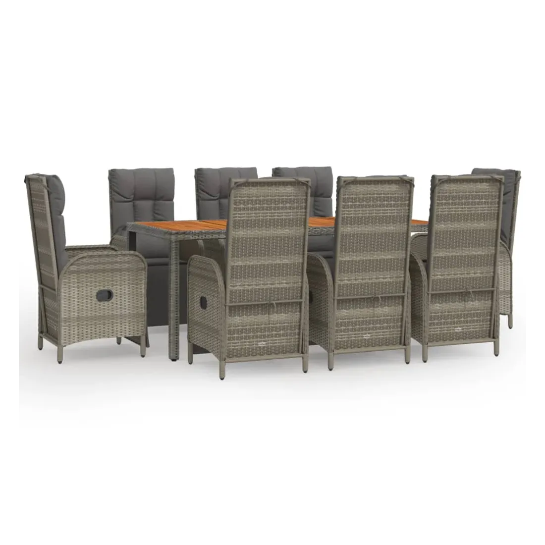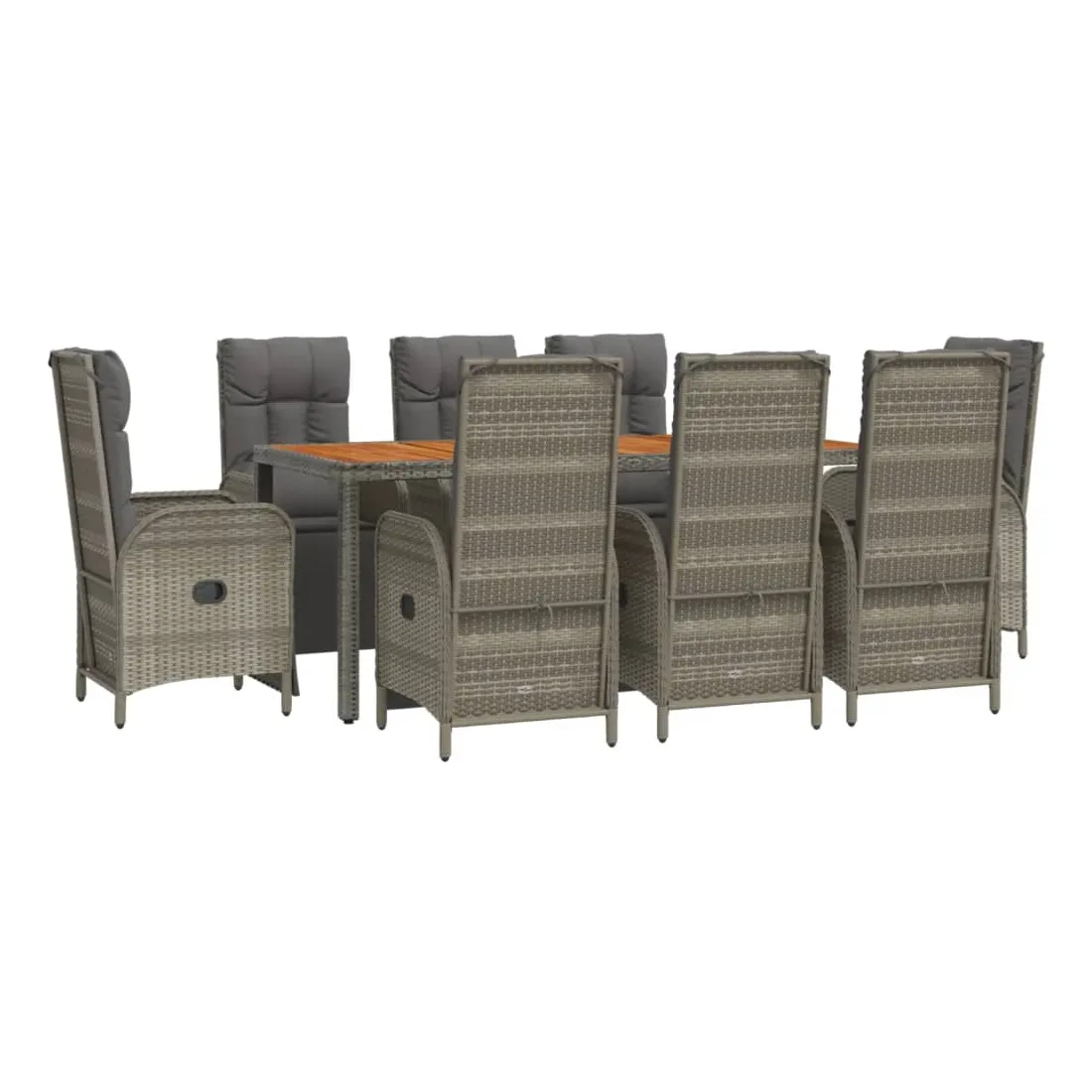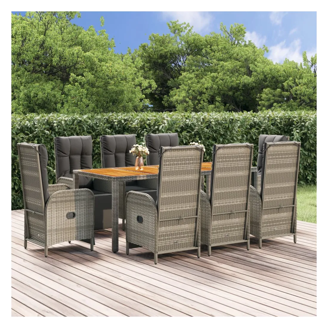 Cet ensemble de salle à manger de jardin tendance, au design élégant et contemporain, est un excellent choix pour manger ou vous détendre dans votre jardin. Matériau résistant aux intempéries : la résine tressée, également connue sous le nom de rotin poly, résiste aux intempéries et est facile à nettoyer. Elle reste belle à l'extérieur pendant une longue période. Elle offre une excellente qualité, commodité et un aspect esthétique.Cadre robuste : les cadres en acier enduit de poudre rendent l'ensemble de salle à manger d'extérieur robuste et stable pour une utilisation quotidienne à l'extérieur.Dessus de table pratique : le dessus de table en bois d'acacia massif est parfait pour placer des boissons, des aliments et des décorations. Il a une belle apparence et est facile à nettoyer.Fonction d'inclinaison : les chaises de jardin sont spécialement conçues avec une fonction d'inclinaison afin que vous puissiez régler le dossier selon votre confort.Expérience d'assise confortable : le dossier ajoute un confort d'assise supplémentaire à la chaise de jardin. De plus, les coussins bien rembourrés vous permettent de vous asseoir confortablement. Bon à savoir :Pour faciliter au maximum le montage, chaque produit est livré avec des instructions. Remarque :Pour que vos meubles d'extérieur restent beaux, nous vous recommandons de les protéger avec une housse imperméable.