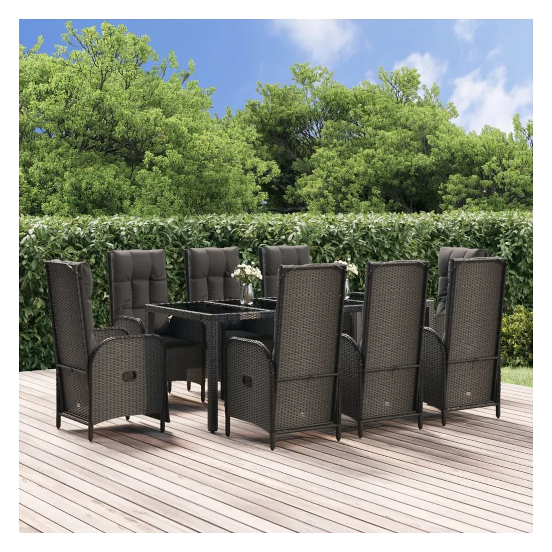 Cet ensemble de salle à manger de jardin tendance, au design élégant et contemporain, est un excellent choix pour manger ou vous détendre dans votre jardin. Matériau résistant aux intempéries : la résine tressée, également connue sous le nom de rotin poly, résiste aux intempéries et est facile à nettoyer. Elle reste belle à l'extérieur pendant une longue période. Elle offre une excellente qualité, commodité et un aspect esthétique.Cadre robuste : les cadres en acier enduit de poudre rendent l'ensemble de salle à manger d'extérieur robuste et stable pour une utilisation quotidienne à l'extérieur.Dessus de table pratique : le dessus de table en bois d'acacia massif est parfait pour placer des boissons, des aliments et des décorations. Il a une belle apparence et est facile à nettoyer.Fonction d'inclinaison : les chaises de jardin sont spécialement conçues avec une fonction d'inclinaison afin que vous puissiez régler le dossier selon votre confort.Expérience d'assise confortable : le dossier ajoute un confort d'assise supplémentaire à la chaise de jardin. De plus, les coussins bien rembourrés vous permettent de vous asseoir confortablement. Bon à savoir :Pour faciliter au maximum le montage, chaque produit est livré avec des instructions. Remarque :Pour que vos meubles d'extérieur restent beaux, nous vous recommandons de les protéger avec une housse imperméable.