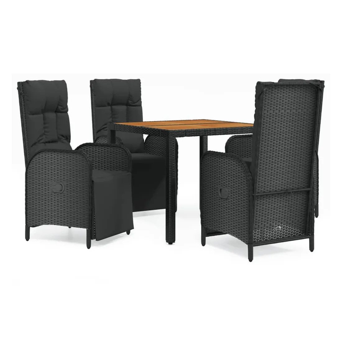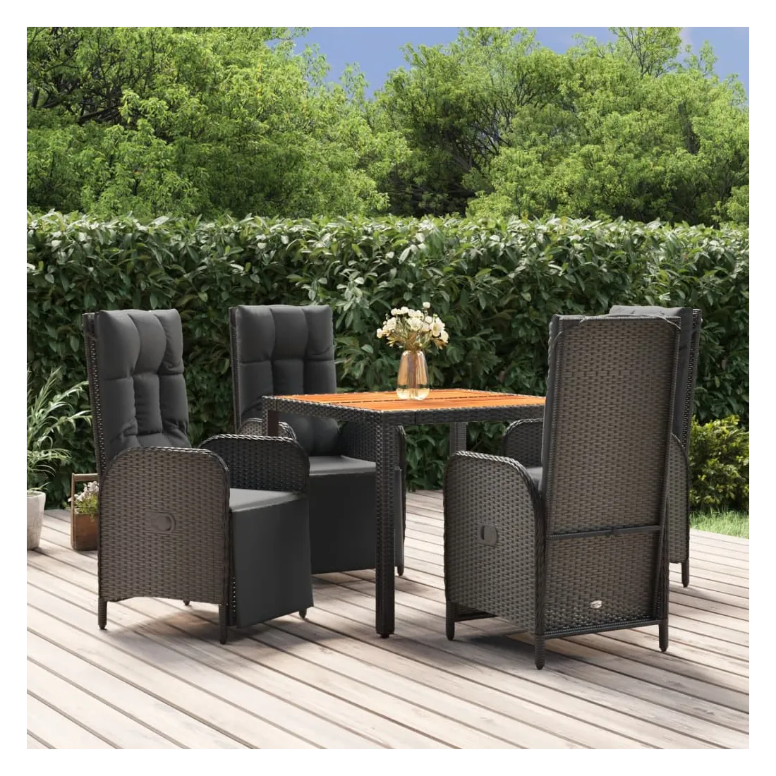 Cet ensemble de salle à manger de jardin tendance, au design élégant et contemporain, est un excellent choix pour manger ou vous détendre dans votre jardin. Matériau résistant aux intempéries : la résine tressée, également connue sous le nom de rotin poly, résiste aux intempéries et est facile à nettoyer. Elle reste belle à l'extérieur pendant une longue période. Elle offre une excellente qualité, commodité et un aspect esthétique.Cadre robuste : les cadres en acier enduit de poudre rendent l'ensemble de salle à manger d'extérieur robuste et stable pour une utilisation quotidienne à l'extérieur.Dessus de table pratique : le dessus de table en bois d'acacia massif est parfait pour placer des boissons, des aliments et des décorations. Il a une belle apparence et est facile à nettoyer.Fonction d'inclinaison : les chaises de jardin sont spécialement conçues avec une fonction d'inclinaison afin que vous puissiez régler le dossier selon votre confort.Expérience d'assise confortable : le dossier ajoute un confort d'assise supplémentaire à la chaise de jardin. De plus, les coussins bien rembourrés vous permettent de vous asseoir confortablement. Bon à savoir :Pour faciliter au maximum le montage, chaque produit est livré avec des instructions. Remarque :Pour que vos meubles d'extérieur restent beaux, nous vous recommandons de les protéger avec une housse imperméable.