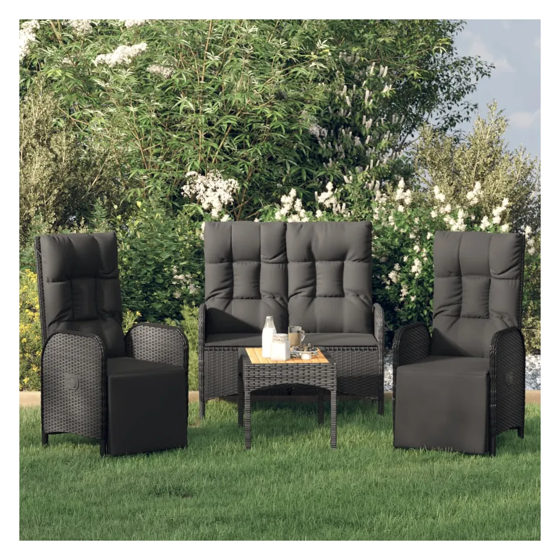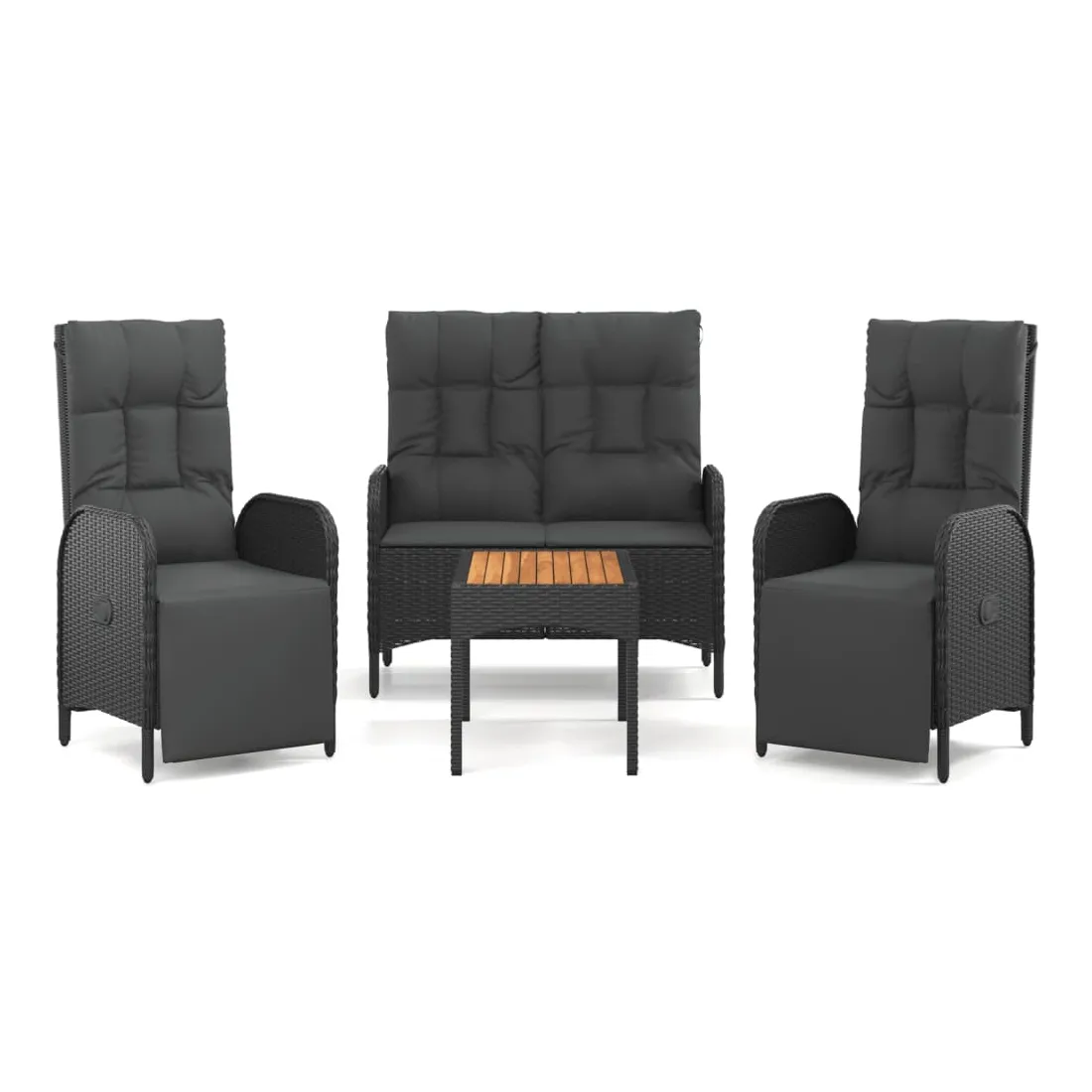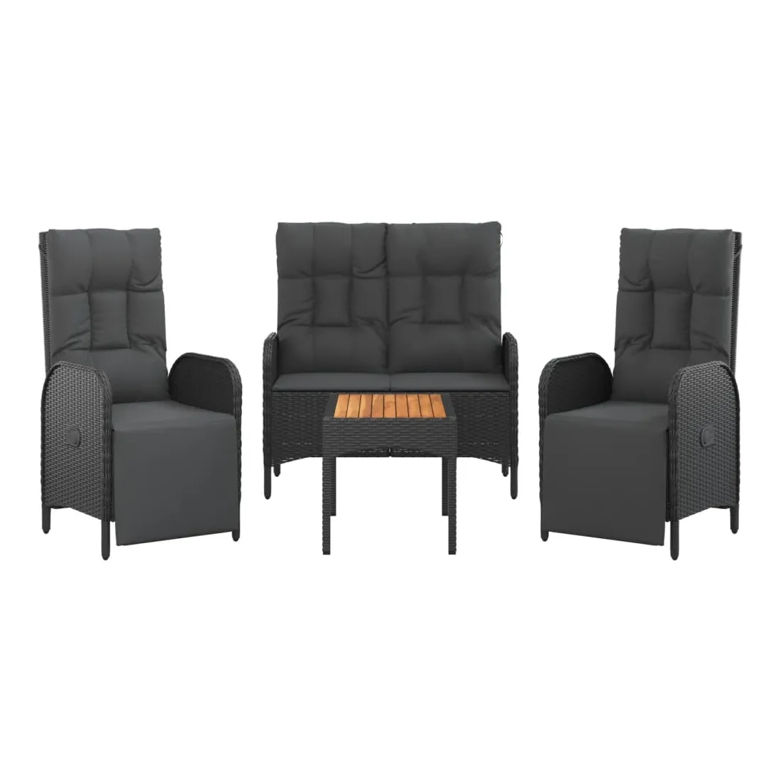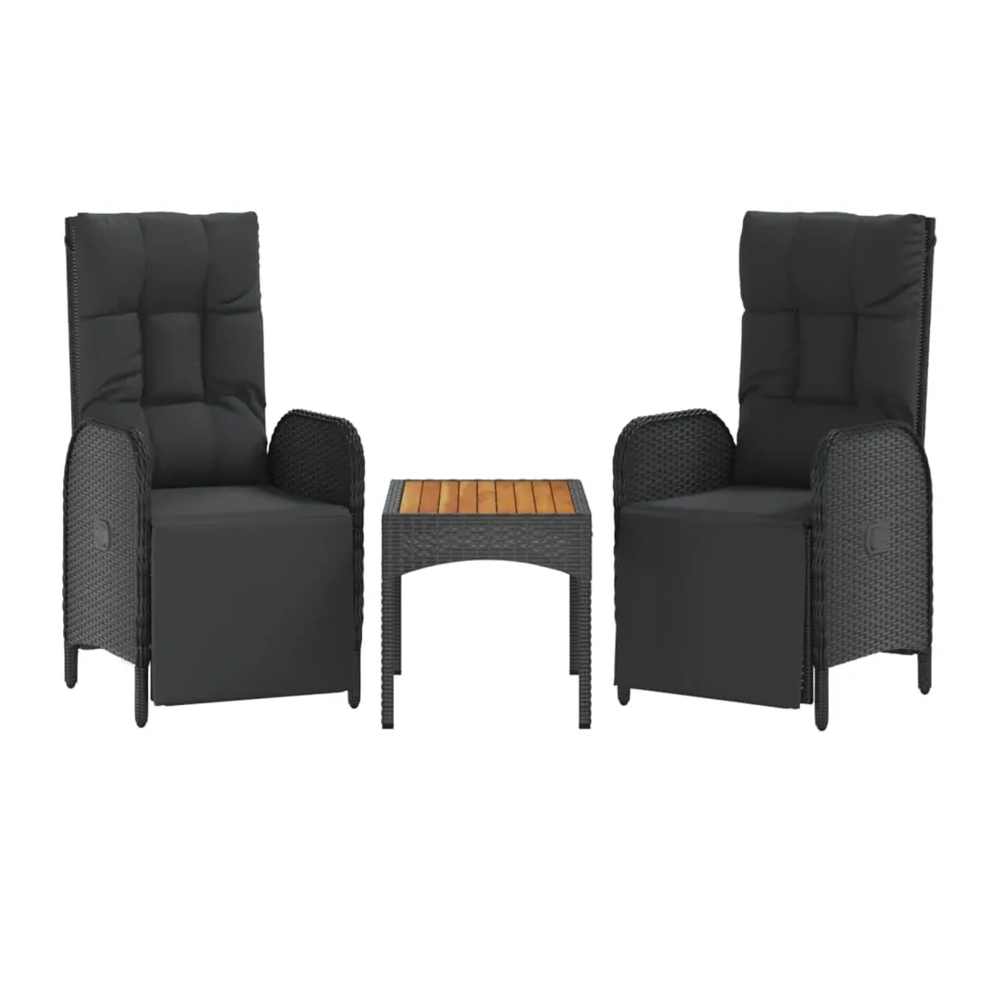 Cet ensemble de salle à manger de jardin tendance, au design élégant et contemporain, est un excellent choix pour manger ou vous détendre dans votre jardin. Matériau résistant aux intempéries : la résine tressée, également connue sous le nom de rotin poly, résiste aux intempéries et est facile à nettoyer. Elle reste belle à l'extérieur pendant une longue période. Elle offre une excellente qualité, commodité et un aspect esthétique.Cadre robuste : les cadres en acier enduit de poudre rendent l'ensemble de salle à manger d'extérieur robuste et stable pour une utilisation quotidienne à l'extérieur.Dessus de table pratique : le dessus de table en bois d'acacia massif est parfait pour placer des boissons, des aliments et des décorations. Il a une belle apparence et est facile à nettoyer.Fonction d'inclinaison : les chaises de jardin sont spécialement conçues avec une fonction d'inclinaison afin que vous puissiez régler le dossier selon votre confort.Expérience d'assise confortable : le dossier ajoute un confort d'assise supplémentaire à la chaise de jardin. De plus, les coussins bien rembourrés vous permettent de vous asseoir confortablement. Bon à savoir :Pour faciliter au maximum le montage, chaque produit est livré avec des instructions. Remarque :Pour que vos meubles d'extérieur restent beaux, nous vous recommandons de les protéger avec une housse imperméable.