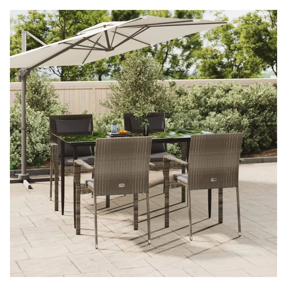 Cet ensemble de salle à manger de jardin tendance, au design élégant et contemporain, est un excellent choix pour manger ou vous détendre dans votre jardin. Matériau résistant aux intempéries : la résine tressée, également connue sous le nom de rotin poly, résiste aux intempéries et est facile à nettoyer. Elle reste belle à l'extérieur pendant une longue période. Elle offre une excellente qualité, commodité et un aspect esthétique.Cadre robuste : les cadres en acier enduit de poudre rendent l'ensemble de salle à manger d'extérieur robuste et stable pour une utilisation quotidienne à l'extérieur.Dessus de table pratique : le dessus lisse de la table de jardin est en verre trempé, facile à nettoyer avec un chiffon humide. De plus, le dessus robuste est parfait pour placer des repas, des boissons et d'autres objets décoratifs.Conception modulaire : l'ensemble de salle à manger de jardin est flexible et facile à déplacer, vous pouvez donc le combiner avec d'autres segments modulaires dans la boutique en ligne pour créer vos propres configurations d'ensemble de salle à manger de jardin !Expérience d'assise confortable : le dossier ajoute un confort d'assise supplémentaire à la chaise de jardin. De plus, les coussins bien rembourrés vous permettent de vous asseoir confortablement. Bon à savoir :Pour faciliter au maximum le montage, chaque produit est livré avec des instructions. Remarque :Pour que vos meubles d'extérieur restent beaux, nous vous recommandons de les protéger avec une housse imperméable.