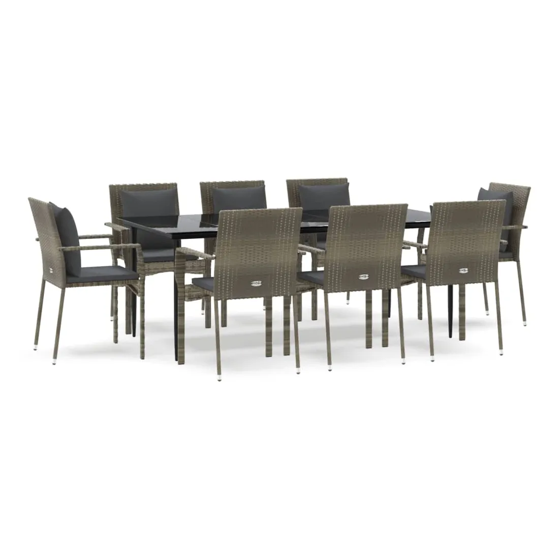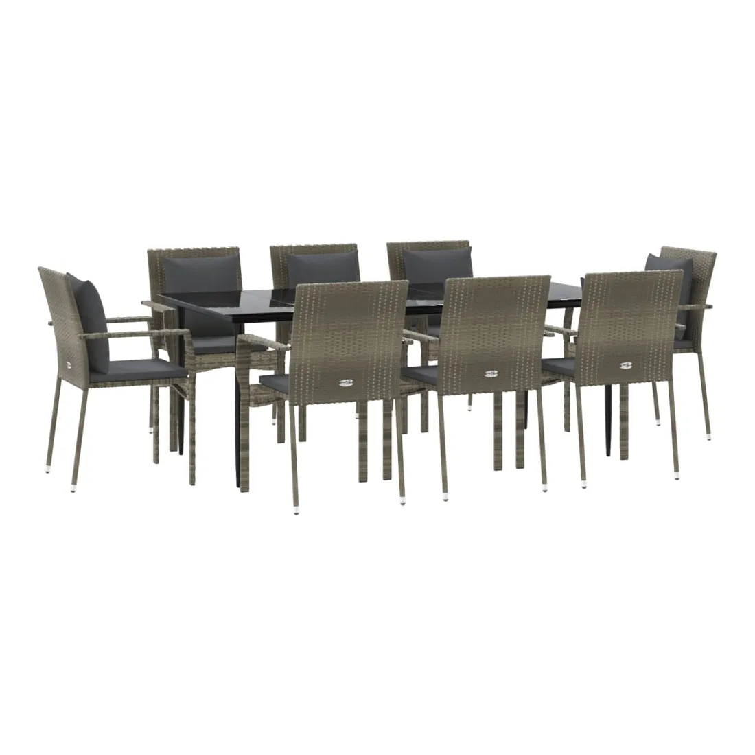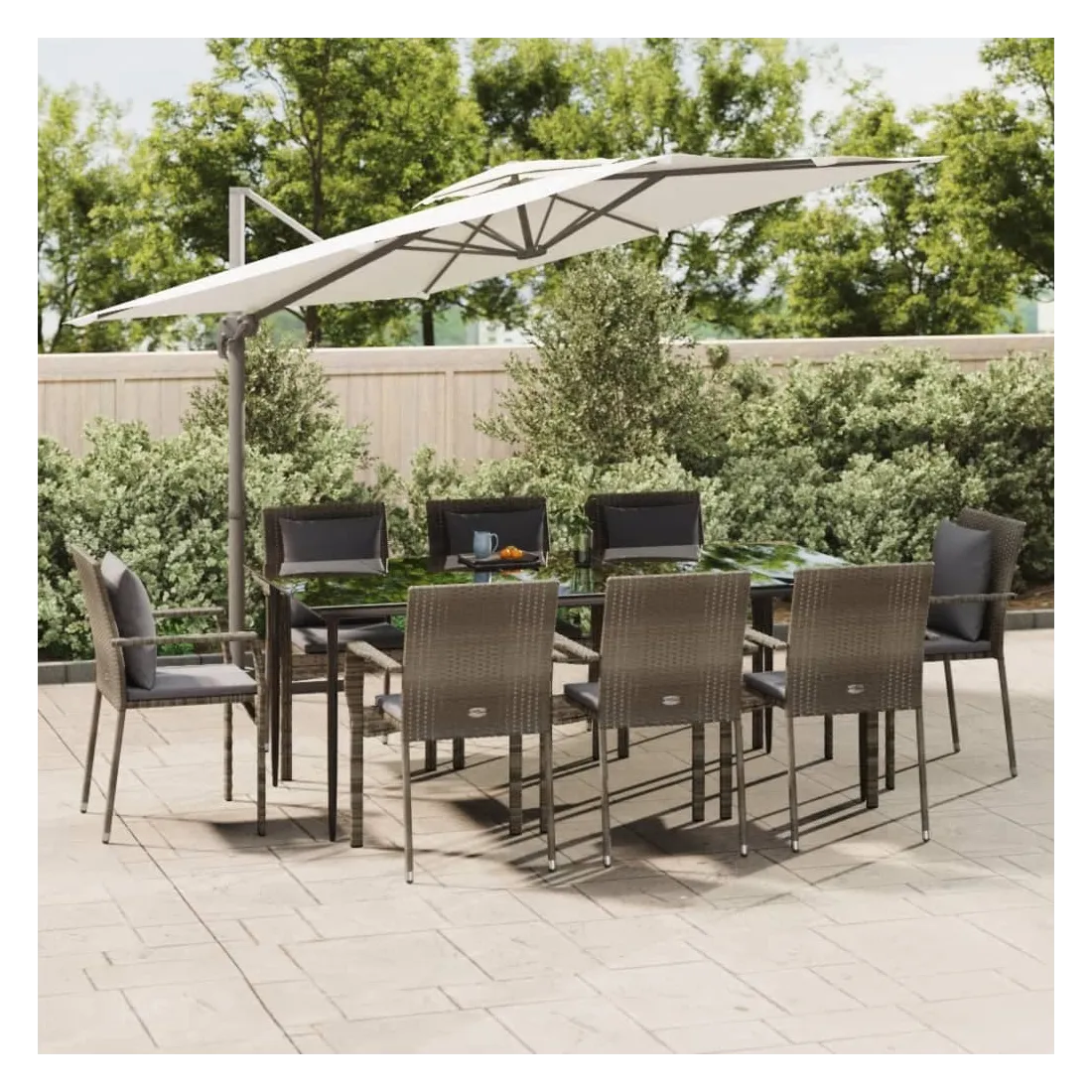 Cet ensemble de salle à manger de jardin tendance, au design élégant et contemporain, est un excellent choix pour manger ou vous détendre dans votre jardin. Matériau résistant aux intempéries : la résine tressée, également connue sous le nom de rotin poly, résiste aux intempéries et est facile à nettoyer. Elle reste belle à l'extérieur pendant une longue période. Elle offre une excellente qualité, commodité et un aspect esthétique.Cadre robuste : les cadres en acier enduit de poudre rendent l'ensemble de salle à manger d'extérieur robuste et stable pour une utilisation quotidienne à l'extérieur.Dessus de table pratique : le dessus lisse de la table de jardin est en verre trempé, facile à nettoyer avec un chiffon humide. De plus, le dessus robuste est parfait pour placer des repas, des boissons et d'autres objets décoratifs.Conception modulaire : l'ensemble de salle à manger de jardin est flexible et facile à déplacer, vous pouvez donc le combiner avec d'autres segments modulaires dans la boutique en ligne pour créer vos propres configurations d'ensemble de salle à manger de jardin !Expérience d'assise confortable : le dossier ajoute un confort d'assise supplémentaire à la chaise de jardin. De plus, les coussins bien rembourrés vous permettent de vous asseoir confortablement. Bon à savoir :Pour faciliter au maximum le montage, chaque produit est livré avec des instructions. Remarque :Pour que vos meubles d'extérieur restent beaux, nous vous recommandons de les protéger avec une housse imperméable.