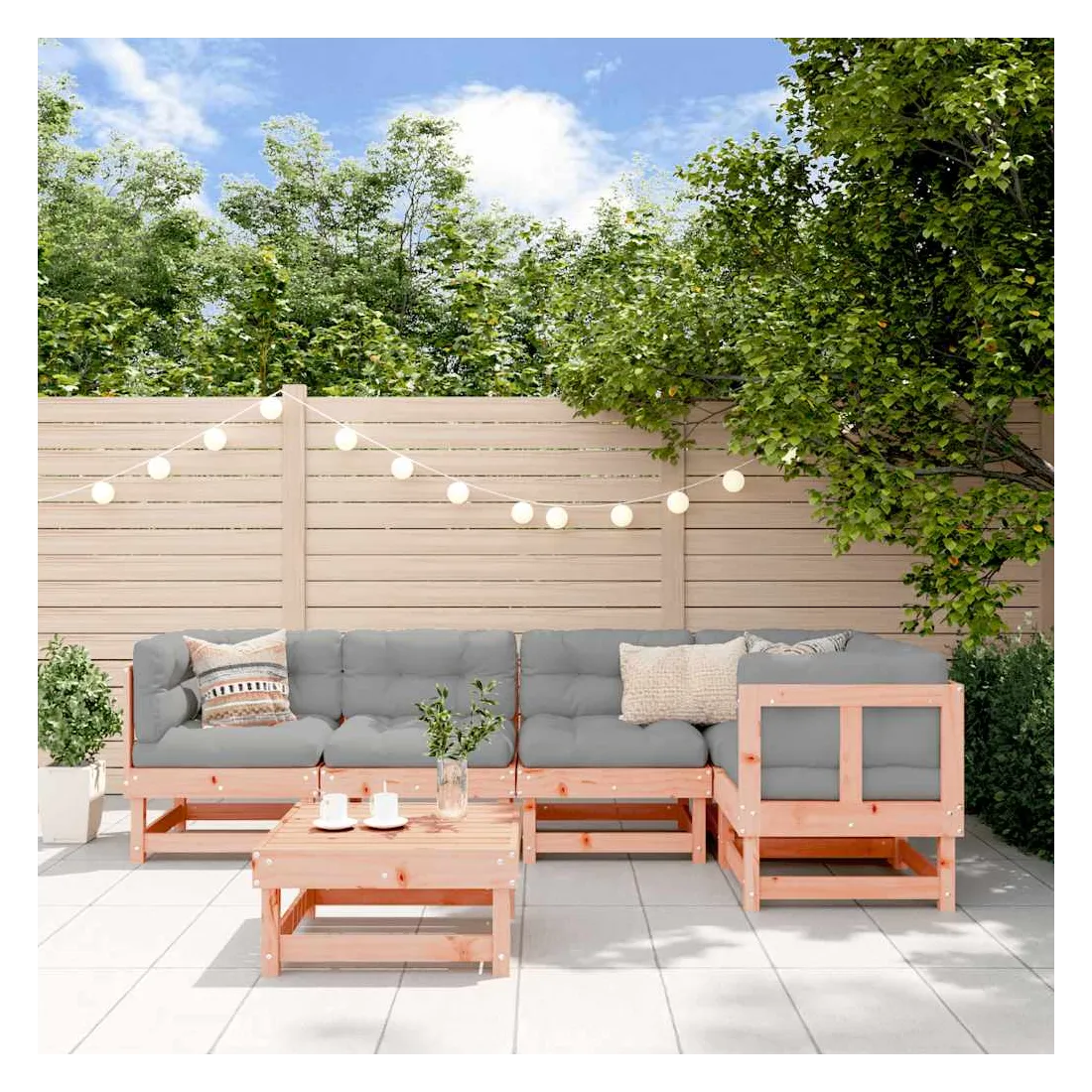 Ce salon de jardin en bois, qui se démarque par son design à lattes et ses coussins moelleux, sera un excellent supplément à votre jardin, patio ou terrasse pour profiter d'un moment agréable avec votre famille ou vos amis. Bois de douglas massif : le bois de douglas massif est un bois très durable qui fonctionne bien pour l'extérieur. Le bois de Douglas est également suffisamment solide pour être travaillé avec un minimum de soin, même sous l'influence des intempéries.Cadre robuste et stable : le cadre en bois rend l'ensemble de salon robuste et stable pour une utilisation quotidienne à l'extérieur.Expérience d'assise confortable : le dossier et l'accoudoir ajoutent un confort d'assise supplémentaire à l'ensemble de meubles de jardin. De plus, les coussins bien rembourrés vous permettent de vous asseoir confortablement.Design modulaire : le canapé est flexible et facile à déplacer. Vous pouvez le combiner avec d'autres segments modulaires de la boutique en ligne pour créer vos propres configurations de salon de jardin ! Bon à savoir :Pour que vos meubles d'extérieur restent beaux, nous vous recommandons de les protéger avec une housse imperméable.