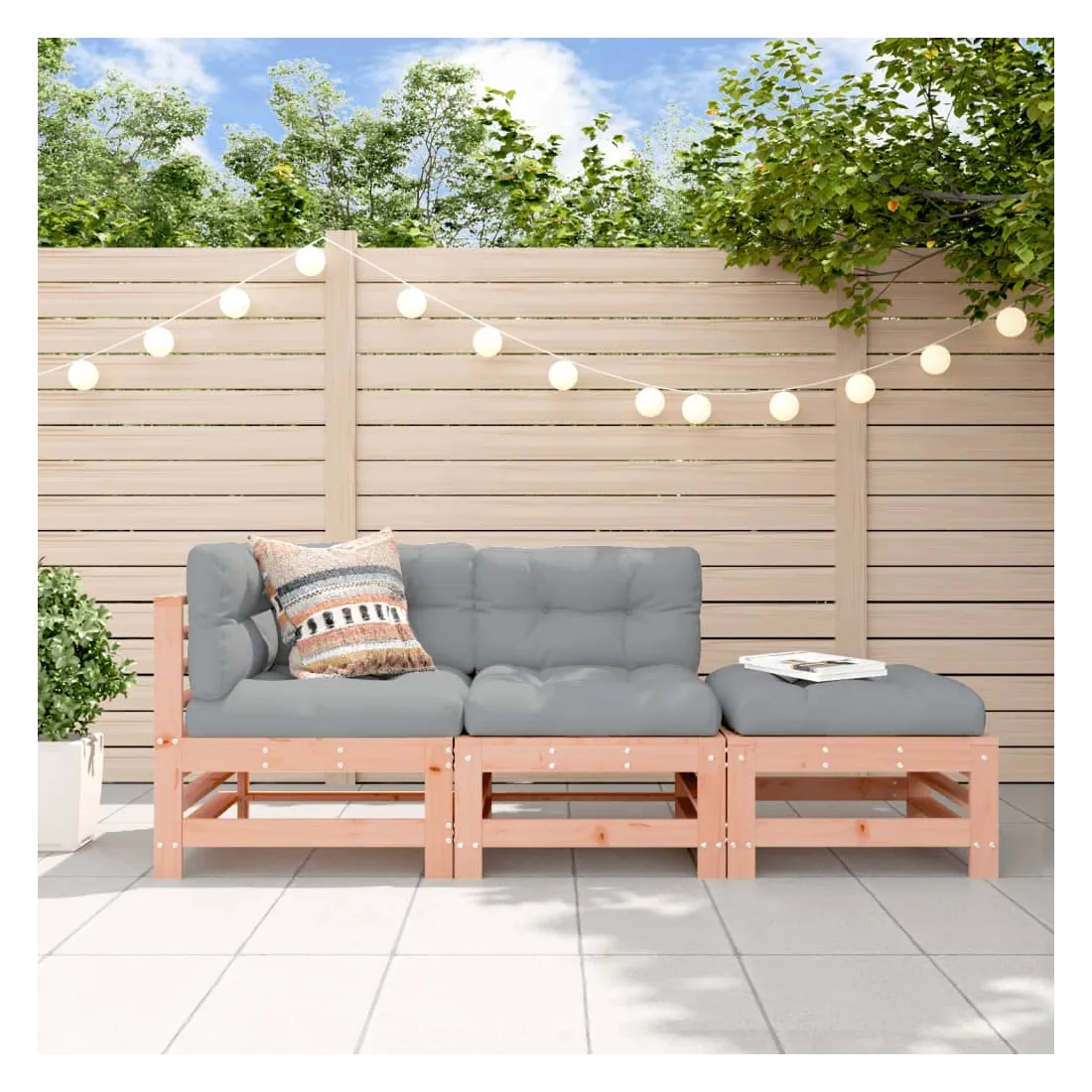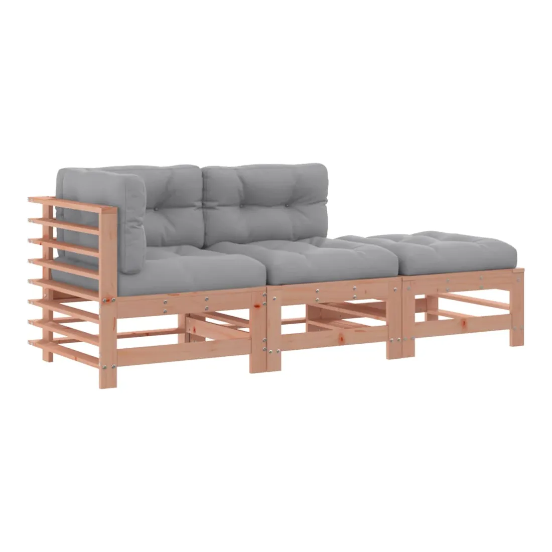 Ce salon de jardin en bois, qui se démarque par son design à lattes et ses coussins moelleux, sera un excellent supplément à votre jardin, patio ou terrasse pour profiter d'un moment agréable avec votre famille ou vos amis. Bois de douglas massif : le bois de douglas massif est un bois très durable qui fonctionne bien pour l'extérieur. Le bois de douglas est également suffisamment solide pour être travaillé avec un minimum de soin, même sous l'influence des intempéries.Cadre robuste et stable : le cadre en bois rend l'ensemble de salon robuste et stable pour une utilisation quotidienne à l'extérieur.Expérience d'assise confortable : le dossier et l'accoudoir ajoutent un confort d'assise supplémentaire à l'ensemble de meubles de jardin. De plus, les coussins bien rembourrés vous permettent de vous asseoir confortablement.Design modulaire : le canapé est flexible et facile à déplacer. Vous pouvez le combiner avec d'autres segments modulaires de la boutique en ligne pour créer vos propres configurations de salon de jardin ! Bon à savoir :Pour que vos meubles d'extérieur restent beaux, nous vous recommandons de les protéger avec une housse imperméable.
