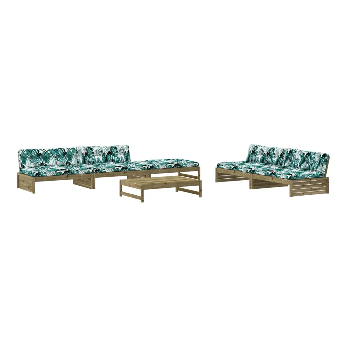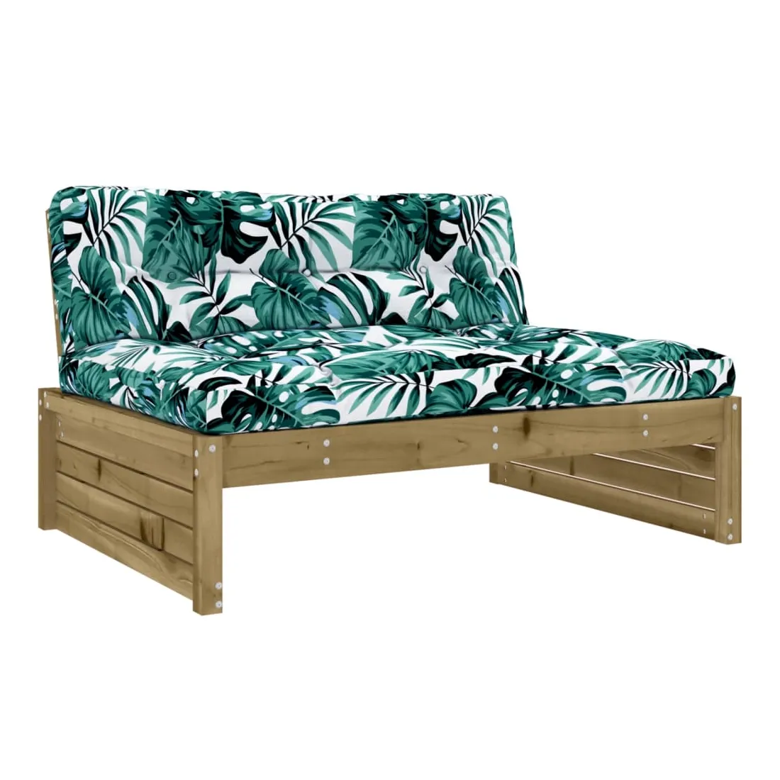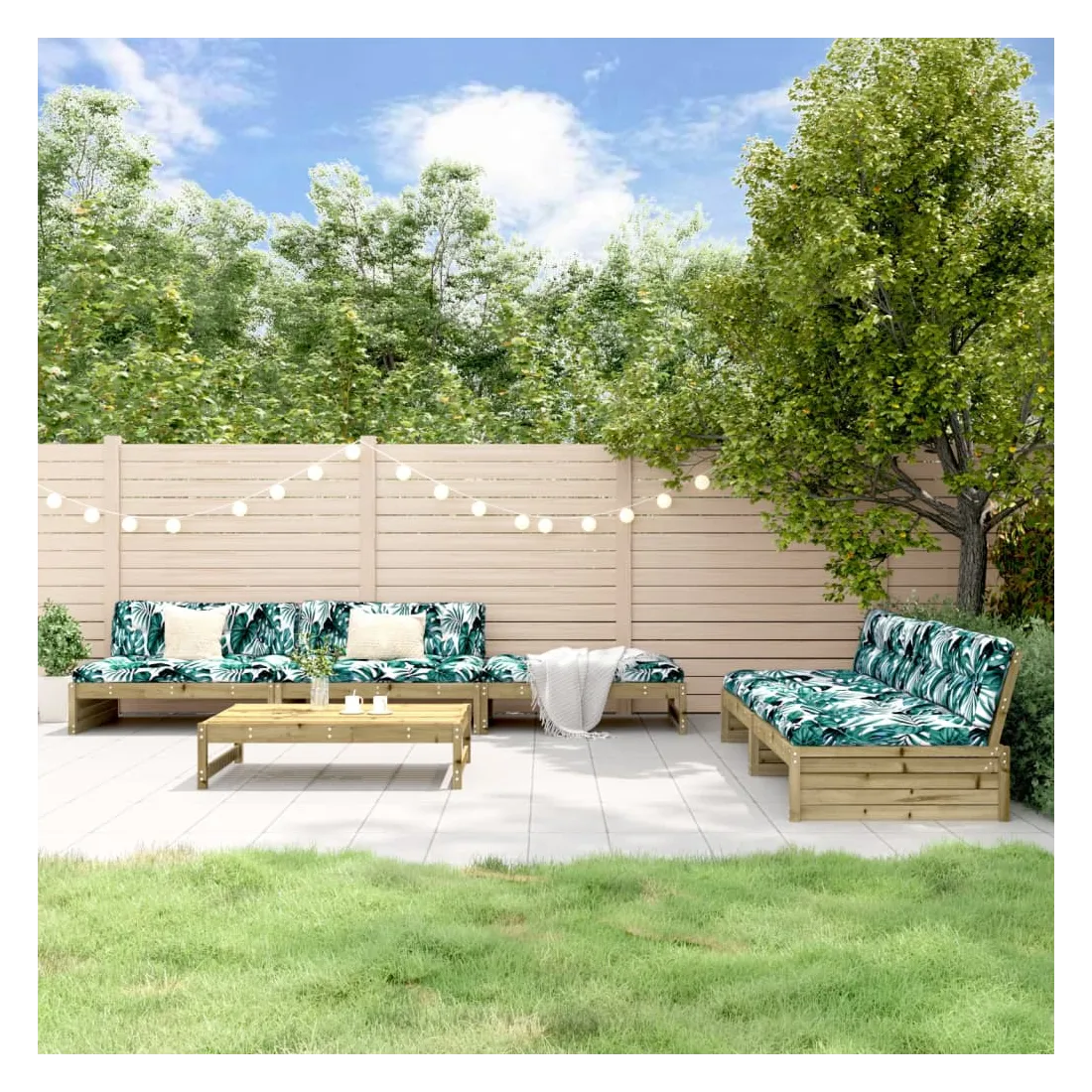 Ce salon de jardin en bois, qui se démarque par son design à lattes et ses coussins moelleux, sera un excellent supplément à votre jardin, patio ou terrasse pour profiter d'un moment agréable avec votre famille ou vos amis. Bois imprégné : le bois de pin massif est un matériau naturel magnifique. Le bois de pin a un grain droit et les nœuds lui confèrent un aspect rustique caractéristique. L'imprégnation est un processus de conservation réalisé à l'aide d'autoclaves. Le traitement sous pression augmente la résistance à la pourriture et aux intempéries.Cadre robuste et stable : les cadres en bois rendent l'ensemble de salon robuste et stable pour une utilisation quotidienne à l'extérieur.Expérience d'assise confortable : le dossier ajoute un confort d'assise supplémentaire à l'ensemble de meubles de jardin. De plus, le coussin bien rembourré vous permet de vous asseoir confortablement.Design modulaire : le canapé est flexible et facile à déplacer. Vous pouvez le combiner avec d'autres segments modulaires de la boutique en ligne pour créer vos propres configurations de salon de jardin ! Bon à savoir :Pour que vos meubles d'extérieur restent beaux, nous vous recommandons de les protéger avec une housse imperméable.