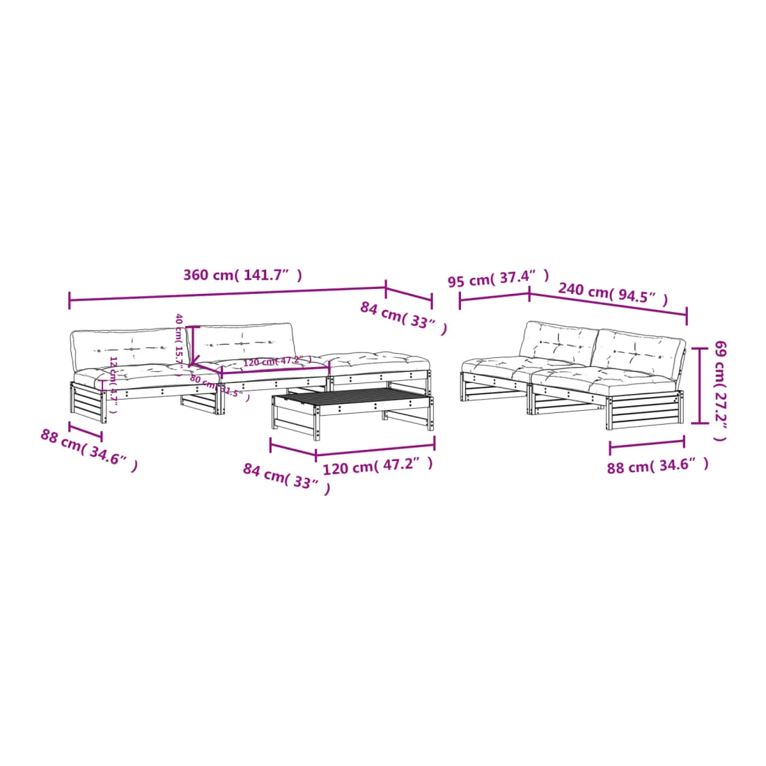 - Dimensions du canapé central : 120 x 95 x 69 cm (L x l x H)