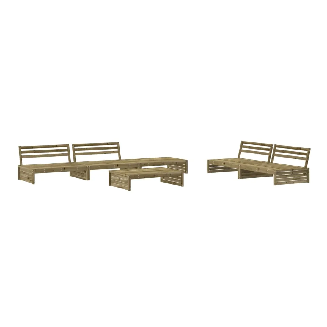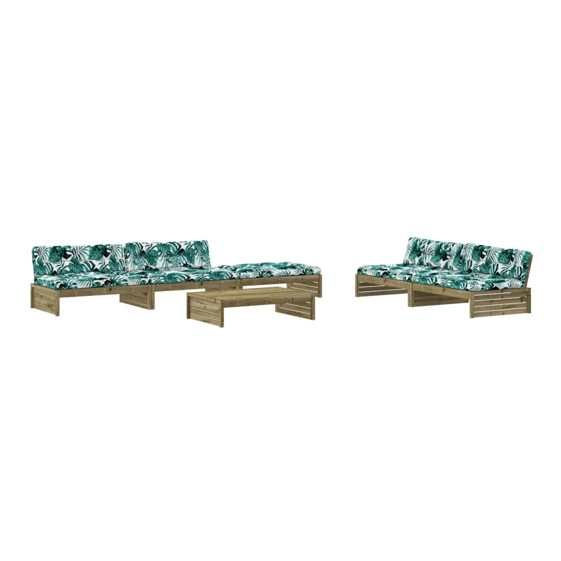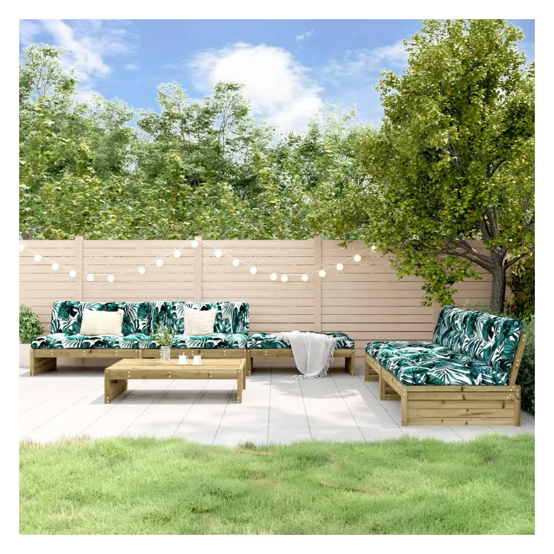 Ce salon de jardin en bois, qui se démarque par son design à lattes et ses coussins moelleux, sera un excellent supplément à votre jardin, patio ou terrasse pour profiter d'un moment agréable avec votre famille ou vos amis. Bois imprégné : le bois de pin massif est un matériau naturel magnifique. Le bois de pin a un grain droit et les nœuds lui confèrent un aspect rustique caractéristique. L'imprégnation est un processus de conservation réalisé à l'aide d'autoclaves. Le traitement sous pression augmente la résistance à la pourriture et aux intempéries.Cadre robuste et stable : les cadres en bois rendent l'ensemble de salon robuste et stable pour une utilisation quotidienne à l'extérieur.Expérience d'assise confortable : le dossier ajoute un confort d'assise supplémentaire à l'ensemble de meubles de jardin. De plus, le coussin bien rembourré vous permet de vous asseoir confortablement.Design modulaire : le canapé est flexible et facile à déplacer. Vous pouvez le combiner avec d'autres segments modulaires de la boutique en ligne pour créer vos propres configurations de salon de jardin ! Bon à savoir :Pour que vos meubles d'extérieur restent beaux, nous vous recommandons de les protéger avec une housse imperméable.
