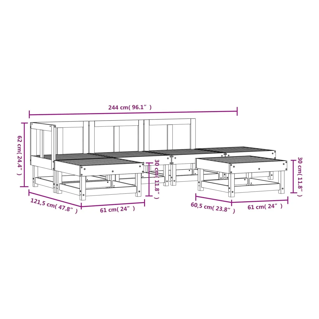 - Dimensions du canapé central : 61 x 60,5 x 62 cm (l x P x H)