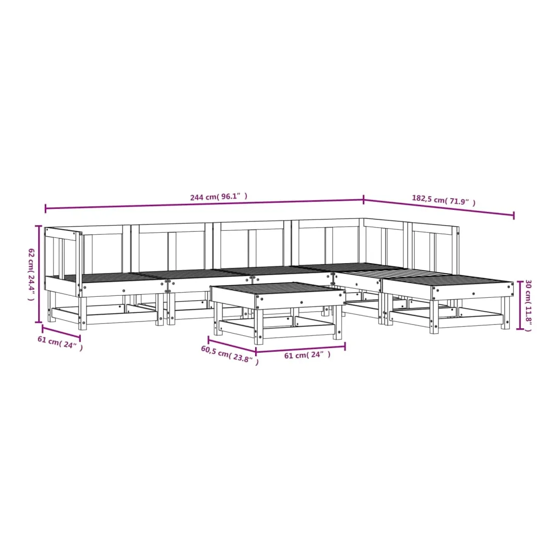 - Dimensions du canapé central : 61 x 60,5 x 62 cm (L x l x H)