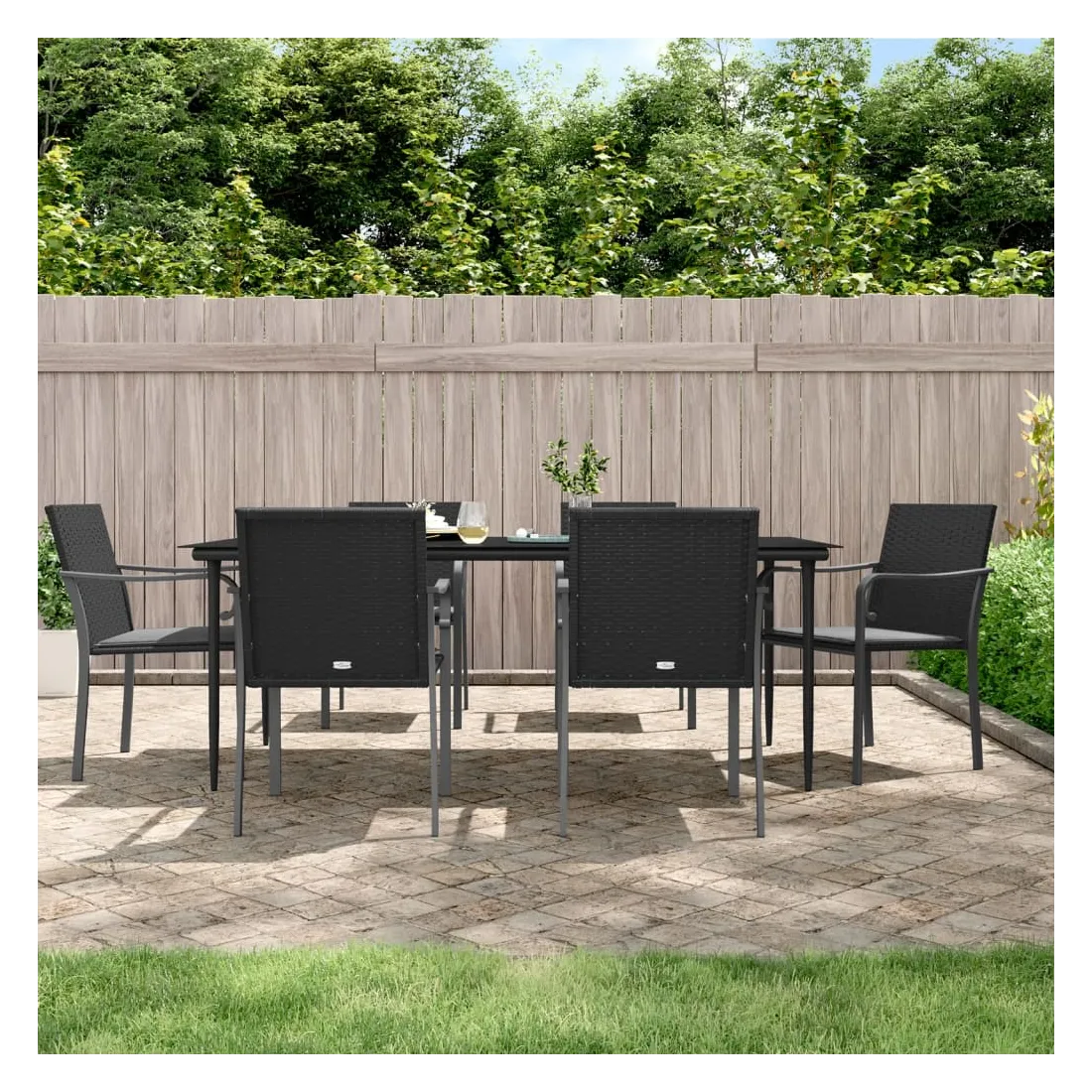 Cet ensemble à manger de jardin, combinant à la fois style et fonctionnalité, est sûrement destiné à être la pièce maîtresse de votre jardin, terrasse et de tout autre espace de vie. Matériau résistant aux intempéries : la résine tressée, également connue sous le nom de rotin poly, résiste aux intempéries et est facile à nettoyer. Elle reste belle à l'extérieur pendant une longue période. Elle offre une excellente qualité, commodité et un aspect esthétique.Cadre robuste et stable : les cadres en acier rendent l'ensemble à manger robuste et stable pour une utilisation quotidienne à l'extérieur.Dessus de table pratique : le plateau lisse de la table à manger est en verre trempé facile à nettoyer avec un chiffon humide. De plus, il offre un excellent support pour contenir vos repas, boissons et autres objets décoratifs.Assise confortable : la chaise de salle à manger est conçue avec des accoudoirs pour vous offrir une expérience d'assise confortable. Le coussin de siège épais et rembourré offre un confort ultime pendant votre temps d'assise. Remarque :Pour que vos meubles d'extérieur restent beaux, nous vous recommandons de les protéger avec une housse imperméable.