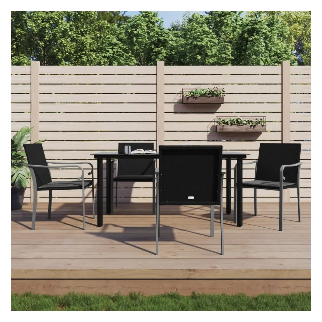 Cet ensemble à manger de jardin, combinant à la fois style et fonctionnalité, est sûrement destiné à être la pièce maîtresse de votre jardin, terrasse et de tout autre espace de vie. Matériau résistant aux intempéries : la résine tressée, également connue sous le nom de rotin poly, résiste aux intempéries et est facile à nettoyer. Elle reste belle à l'extérieur pendant une longue période. Elle offre une excellente qualité, commodité et un aspect esthétique.Cadre robuste et stable : les cadres en acier rendent l'ensemble à manger robuste et stable pour une utilisation quotidienne à l'extérieur.Dessus de table pratique : le plateau lisse de la table à manger est en verre trempé facile à nettoyer avec un chiffon humide. De plus, il offre un excellent support pour contenir vos repas, boissons et autres objets décoratifs.Assise confortable : la chaise de salle à manger est conçue avec des accoudoirs pour vous offrir une expérience d'assise confortable. Le coussin de siège épais et rembourré offre un confort ultime pendant votre temps d'assise. Remarque :Pour que vos meubles d'extérieur restent beaux, nous vous recommandons de les protéger avec une housse imperméable.