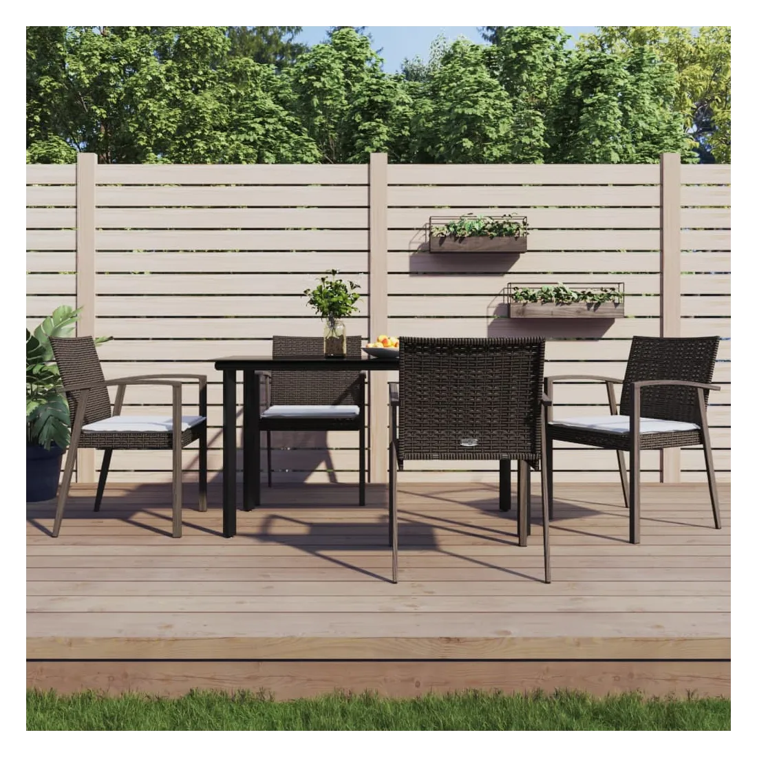 Cet ensemble à manger de jardin, combinant à la fois style et fonctionnalité, est sûrement destiné à être la pièce maîtresse de votre jardin, terrasse et de tout autre espace de vie. Matériau résistant aux intempéries : la résine tressée, également connue sous le nom de rotin poly, résiste aux intempéries et est facile à nettoyer. Elle reste belle à l'extérieur pendant une longue période. Elle offre une excellente qualité, commodité et un aspect esthétique.Cadre robuste et stable : les cadres en acier rendent l'ensemble à manger robuste et stable pour une utilisation quotidienne à l'extérieur.Dessus de table pratique : le plateau lisse de la table à manger est en verre trempé facile à nettoyer avec un chiffon humide. De plus, il offre un excellent support pour contenir vos repas, boissons et autres objets décoratifs.Assise confortable : la chaise de salle à manger est conçue avec des accoudoirs pour vous offrir une expérience d'assise confortable. Le coussin de siège épais et rembourré offre un confort ultime pendant votre temps d'assise. Remarque :Pour que vos meubles d'extérieur restent beaux, nous vous recommandons de les protéger avec une housse imperméable.