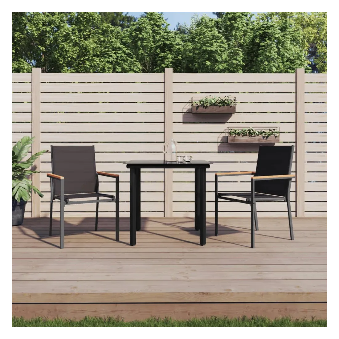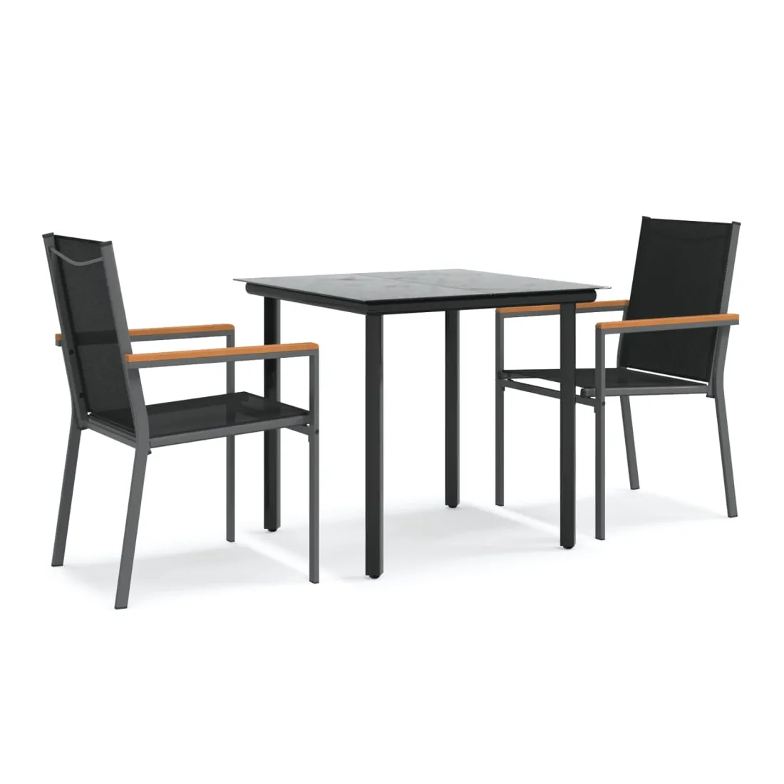 Détendez-vous et profitez d'un bon thé de l'après-midi ou de n'importe quel repas avec votre famille et vos amis autour de cet ensemble de salle à manger de jardin ! Matériau durable : le tissu en textilène permet à l'air de circuler librement à travers lui tout en étant résistant aux rayons UV. Le textilène est donc idéal pour les temps chauds. En tant que matériau durable et solide, il est très résistant aux déchirures, aux perforations et aux moisissures.Cadre robuste et stable : les cadres en acier rendent l'ensemble à manger robuste et stable pour une utilisation quotidienne à l'extérieur.Dessus de table pratique : le plateau lisse de la table à manger est en verre trempé facile à nettoyer avec un chiffon humide. De plus, il offre un excellent support pour contenir vos repas, boissons et autres objets décoratifs.Assise confortable : la chaise à manger est conçue avec un dossier et des accoudoirs pour vous offrir une expérience d'assise confortable. Remarque :Pour que vos meubles d'extérieur restent beaux, nous vous recommandons de les protéger avec une housse imperméable.