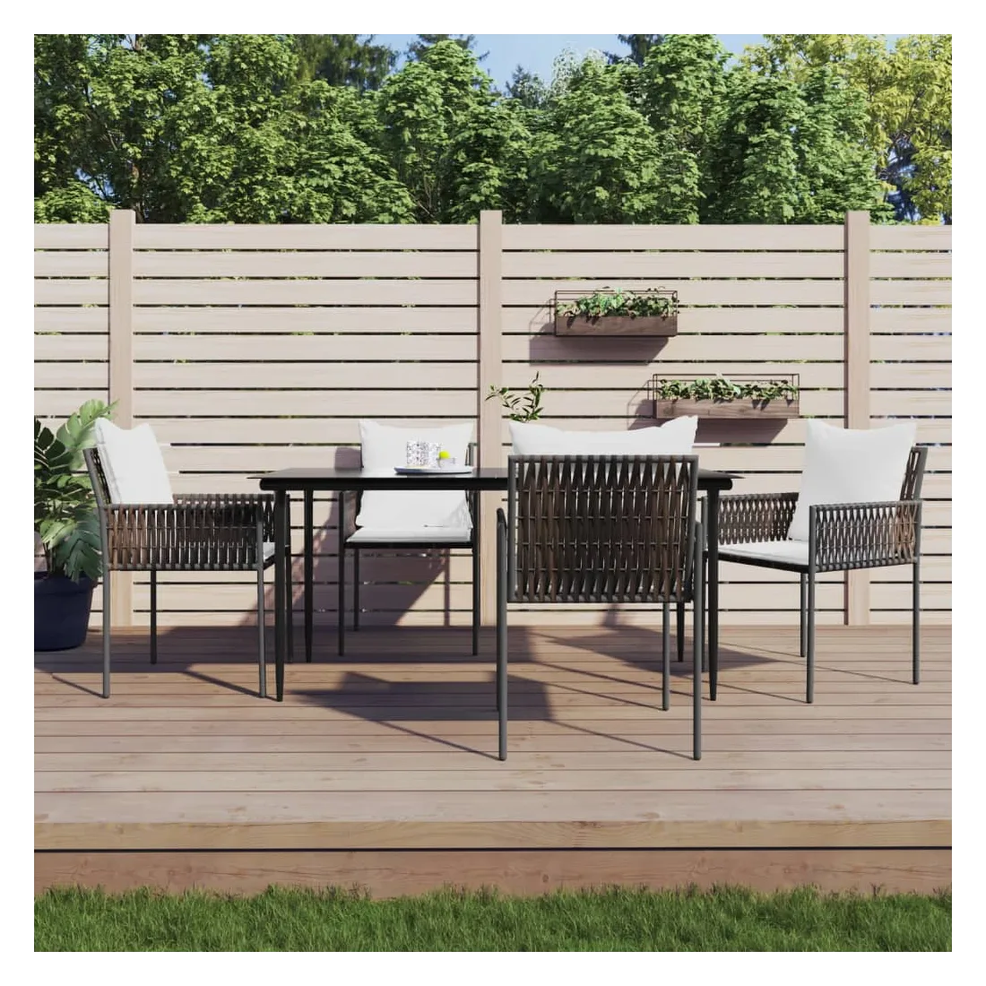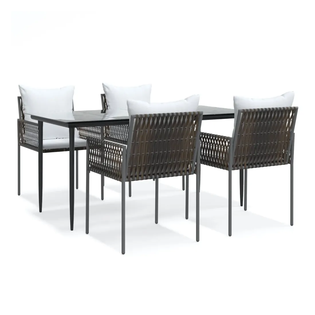 Détendez-vous et profitez d'un bon thé de l'après-midi ou de n'importe quel repas avec votre famille et vos amis autour de cet ensemble de salle à manger de jardin ! Matériau durable : la résine tressée, également connue sous le nom de rotin poly, résiste aux intempéries et est facile à nettoyer. Elle reste belle à l'extérieur pendant une longue période. Elle offre une excellente qualité, commodité et un aspect esthétique.Cadre robuste et stable : les cadres en acier rendent l'ensemble à manger robuste et stable pour une utilisation quotidienne à l'extérieur.Dessus de table pratique : le plateau lisse de la table à manger est en verre trempé facile à nettoyer avec un chiffon humide. De plus, il offre un excellent support pour contenir vos repas, boissons et autres objets décoratifs.Assise confortable : la chaise à manger est conçue avec un dossier et des accoudoirs pour vous offrir une expérience d'assise confortable. De plus, les coussins épais rembourrés offrent un confort ultime pour votre temps d'assise. Remarque :Pour que vos meubles d'extérieur restent beaux, nous vous recommandons de les protéger avec une housse imperméable.