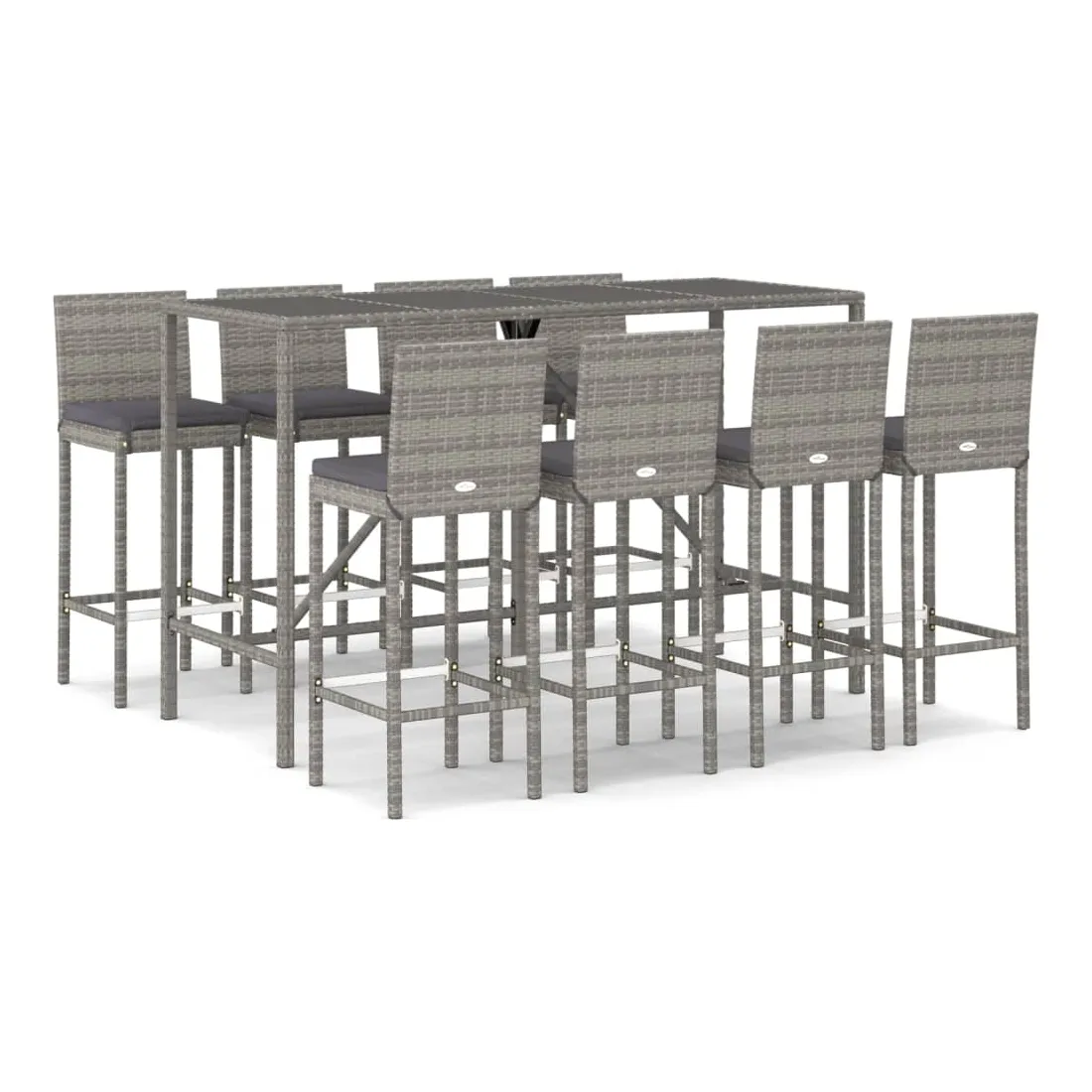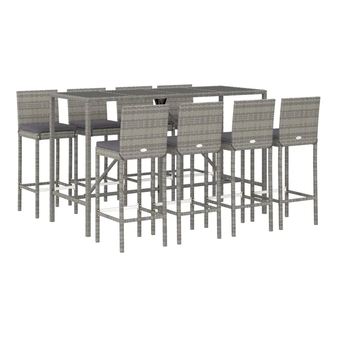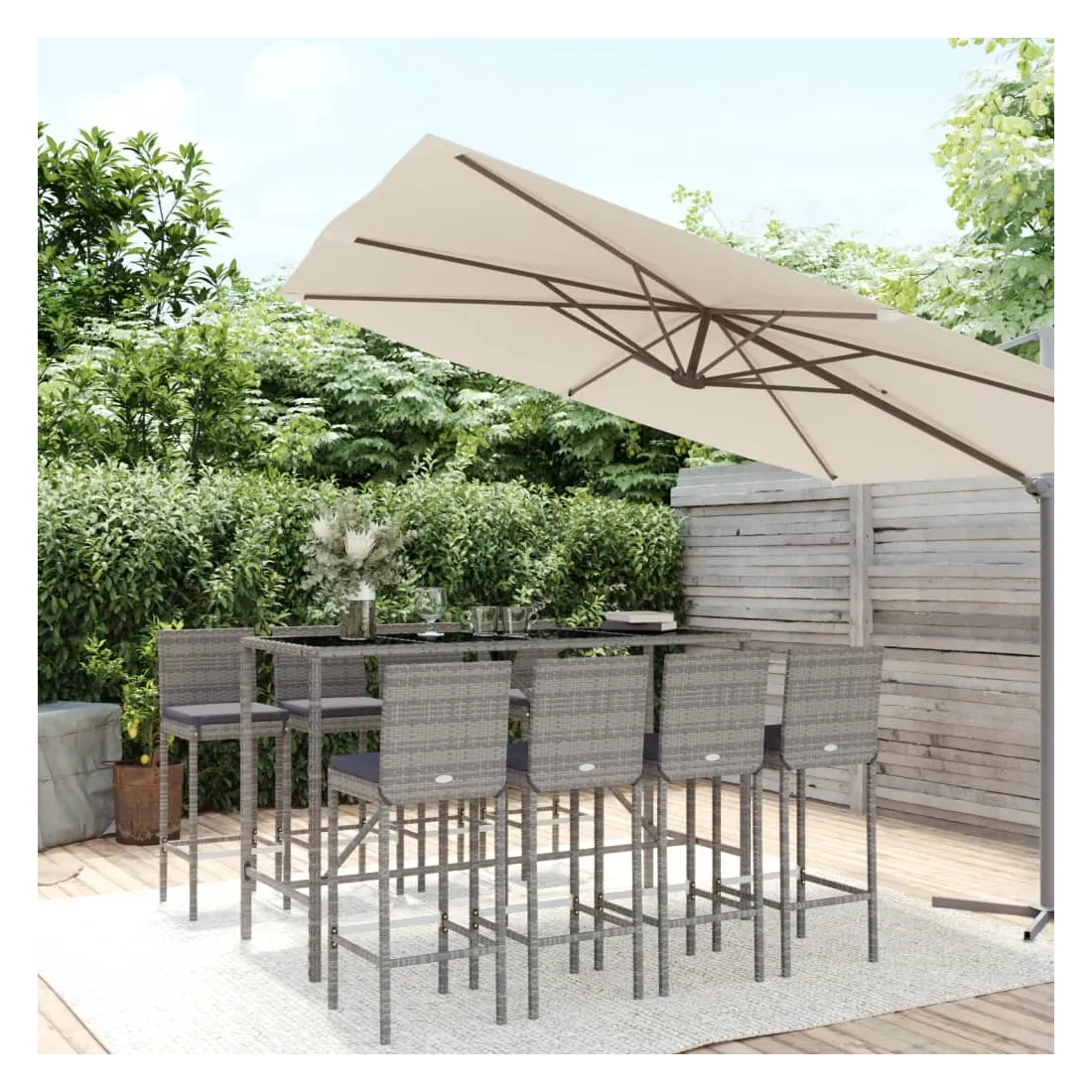 Cet ensemble de bar de jardin tendance, combinant à la fois style et fonctionnalité, est sûrement destiné à être la pièce maîtresse de votre jardin, terrasse et de tout autre espace de vie. Matériau résistant aux intempéries : la résine tressée, également connue sous le nom de rotin poly, résiste aux intempéries et est facile à nettoyer. Elle reste belle à l'extérieur pendant une longue période. Elle offre une excellente qualité, commodité et un aspect esthétique.Assise confortable : le tabouret de bar est conçu avec un dossier et un repose-pieds intégré pour vous offrir une assise confortable. Le coussin de siège bien rembourré offre un confort ultime pendant votre temps assis.Dessus en verre trempé : le dessus est en verre trempé, ce qui le rend facile à nettoyer. De plus, il offre un excellent support pour placer vos boissons, collations et vos décorations préférées.Cadre robuste et stable : les cadres en acier enduit de poudre rendent l'ensemble de pub robuste et stable pour une utilisation quotidienne à l'extérieur.Applications larges : la table et le tabouret de bar, avec leur design remarquable, créent un aspect général agréable qui s'intègre sans effort dans n'importe quel décor. Bon à savoir :Pour faciliter au maximum le montage, chaque produit est livré avec des instructions.Remarque :Pour que vos meubles d'extérieur restent beaux, nous vous recommandons de les protéger avec une housse imperméable.