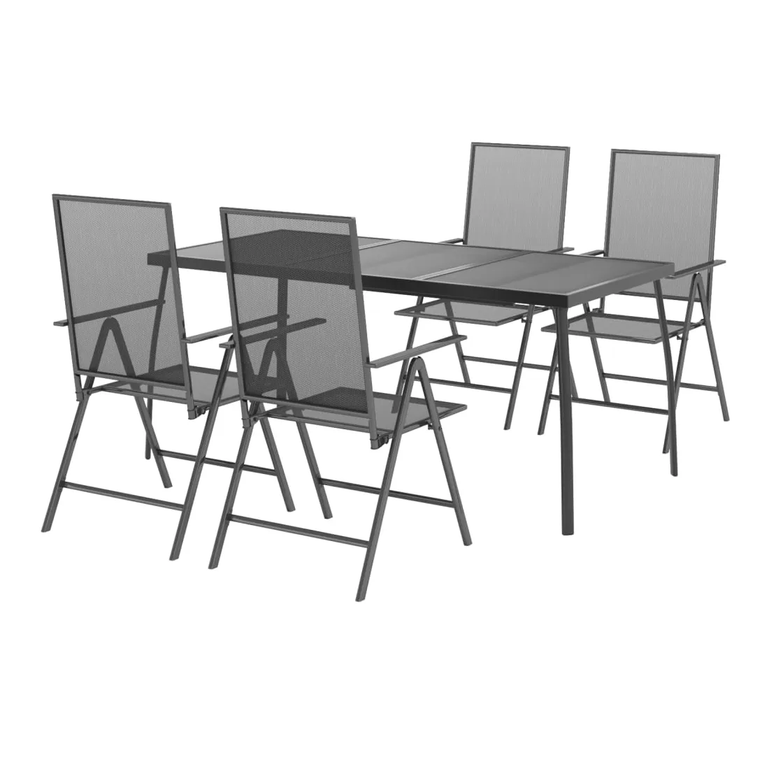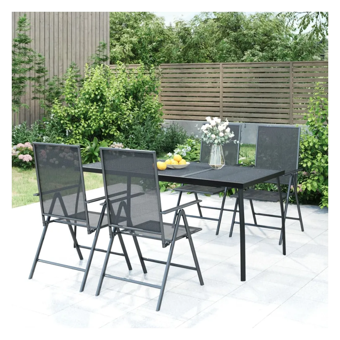 Cet ensemble de salle à manger de jardin tendance, au design élégant et contemporain, est un choix parfait pour vous détendre dans votre jardin. Matériau robuste : l'acier est un matériau exceptionnellement dur et solide. Il offre robustesse et stabilité. Le revêtement par poudre et le revêtement électronique de l'acier créent une couche protectrice contre l'usure et la corrosion.Cadre stable : le cadre en acier enduit de poudre et e-coated assure la robustesse et la stabilité de l'ensemble de salle à manger.Fonction réglable et pliable : les dossiers des chaises de salle à manger sont réglables en 6 positions selon votre confort. Vous pouvez les replier pour économiser de l'espace lorsqu'ils ne sont pas utilisés.Table pratique : le dessus robuste de la table à manger est parfait pour placer des repas, des boissons et d'autres objets décoratifs.Design en maille : l'ensemble de salle à manger d'extérieur avec un design en maille a un aspect simple et intemporel et convient aux balcons, porches, jardins, terrasses, etc. Remarque :Pour que vos meubles d'extérieur restent beaux, nous vous recommandons de les protéger avec une housse imperméable.