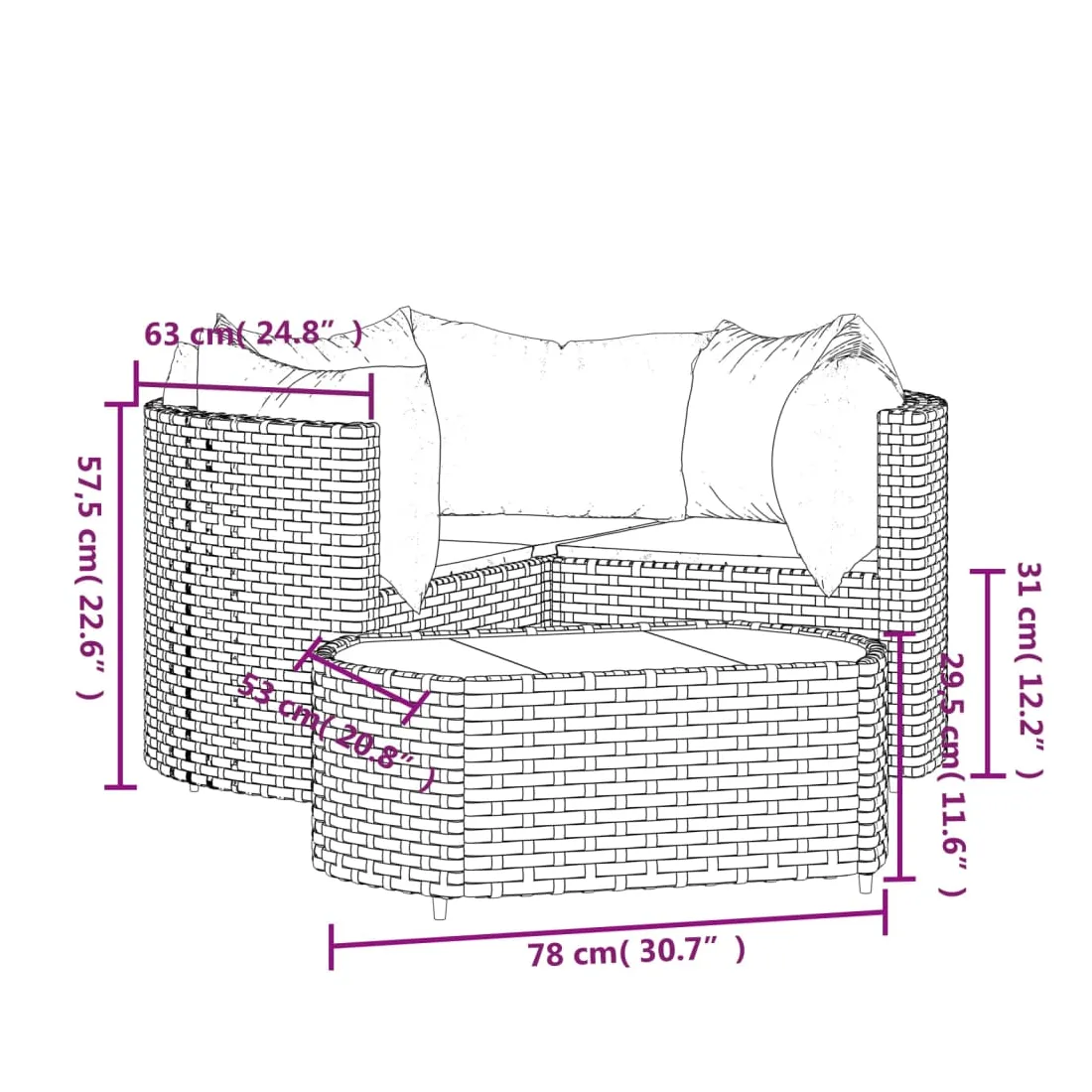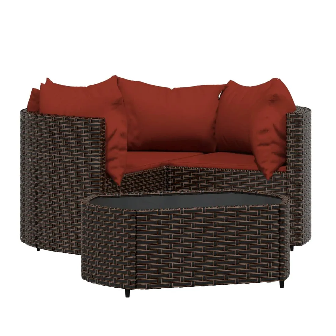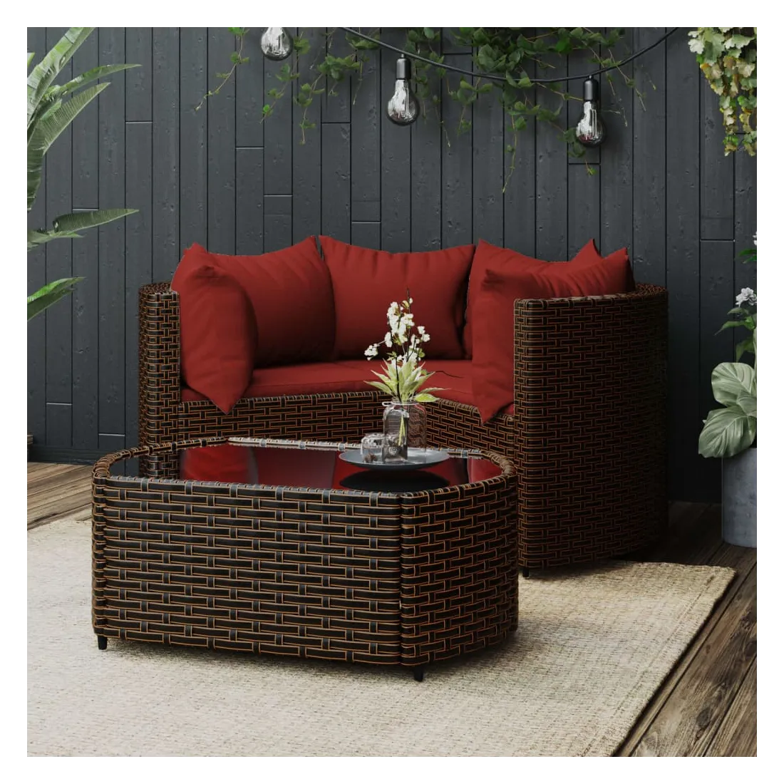 Cet ensemble de salon de jardin tendance, au design élégant et contemporain, est un excellent choix pour manger ou vous détendre dans votre jardin. Matériau résistant aux intempéries : la résine tressée, également connue sous le nom de rotin poly, résiste aux intempéries et est facile à nettoyer. Elle reste belle à l'extérieur pendant une longue période. Elle offre une excellente qualité, commodité et un aspect esthétique.Cadre robuste : les cadres en acier enduit de poudre rendent l'ensemble de salon d'extérieur robuste et stable pour une utilisation quotidienne à l'extérieur.Dessus de table pratique : le dessus lisse de la table de jardin est en verre trempé, facile à nettoyer avec un chiffon humide. De plus, le dessus robuste est parfait pour placer des repas, des boissons et d'autres objets décoratifs.Conception modulaire : l'ensemble de salon de jardin est flexible et facile à déplacer, vous pouvez donc le combiner avec d'autres segments modulaires dans la boutique en ligne pour créer vos propres configurations d'ensemble de salon de jardin !Expérience d'assise confortable : le dossier ajoute un confort d'assise supplémentaire au canapé de jardin. De plus, les coussins bien rembourrés offrent du confort pendant votre temps d'assise. Bon à savoir :Pour faciliter au maximum le montage, chaque produit est livré avec des instructions. Remarque :Le produit est conçu pour une utilisation à l'extérieur uniquement. Ne le rangez pas à l'intérieur.Pour que vos meubles d'extérieur restent beaux, nous vous recommandons de les protéger avec une housse imperméable.