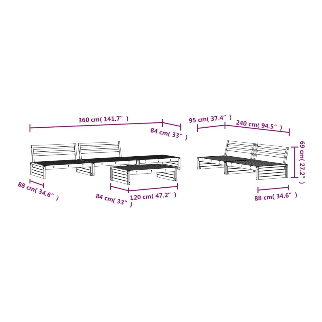 - Dimensions du canapé central : 120 x 95 x 69 cm (L x l x H)