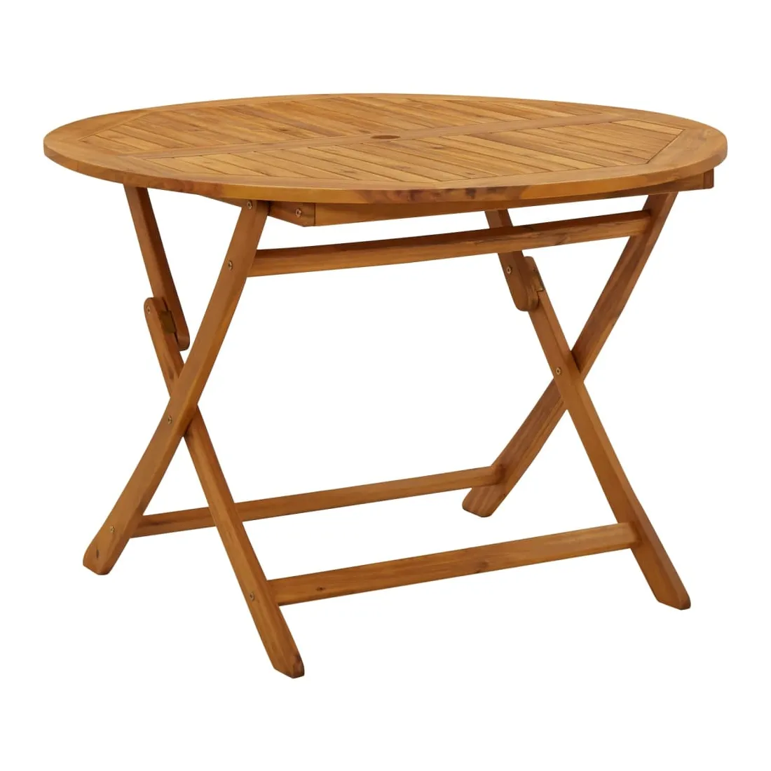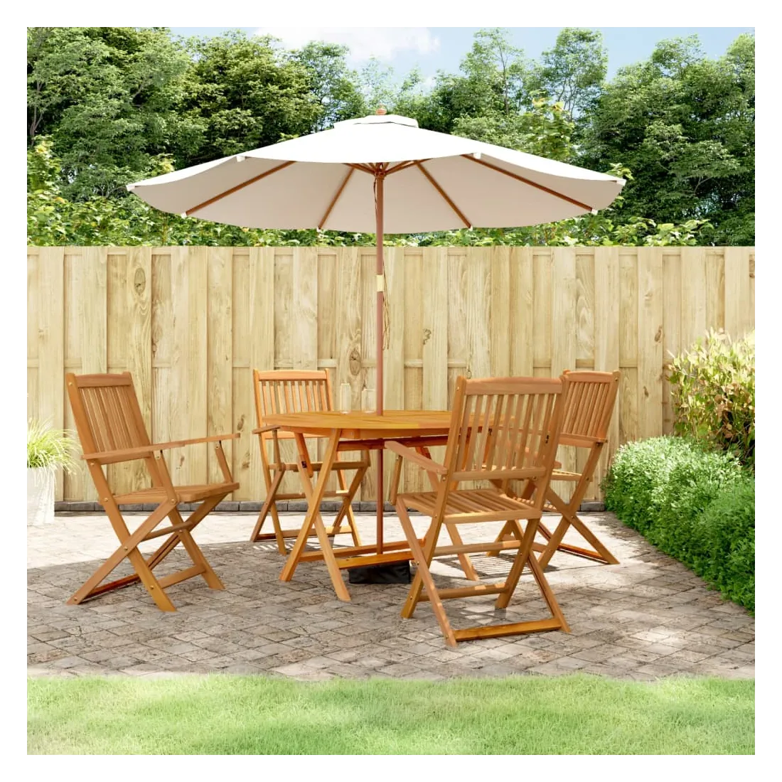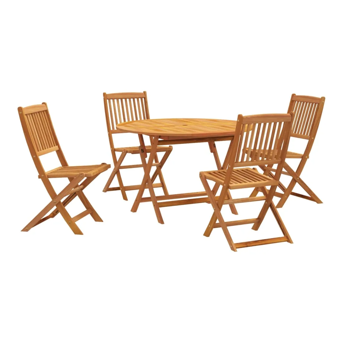 Cet ensemble à manger de jardin en bois, au design élégant et rétro, est un excellent choix pour manger ou vous détendre dans le jardin. Bois d'acacia massif : le bois d'acacia massif est un matériau naturel magnifique. Le bois d'acacia est un bois dur tropical, qui est dense, robuste et durable. Fabriqué en bois d'acacia, l'ensemble à manger convient à une utilisation intérieure et extérieure.Table pratique : cette table à manger vous offre un dessus de table solide. Vous pouvez placer vos collations, boissons et n'importe laquelle de vos décorations préférées. Le dessus de table est pourvu d'un trou pour parasol, ce qui permet de fixer facilement un parasol pour créer un coin ombragé.Design pliable : cet ensemble à manger peut être plié pour économiser de l'espace lorsqu'il n'est pas utilisé.Surface facile à nettoyer : la surface à finition à l'huile rend l'ensemble de meubles de jardin facile à nettoyer avec un chiffon humide. Bon à savoir :Pour que vos meubles d'extérieur restent beaux, nous vous recommandons de les protéger avec une housse imperméable.