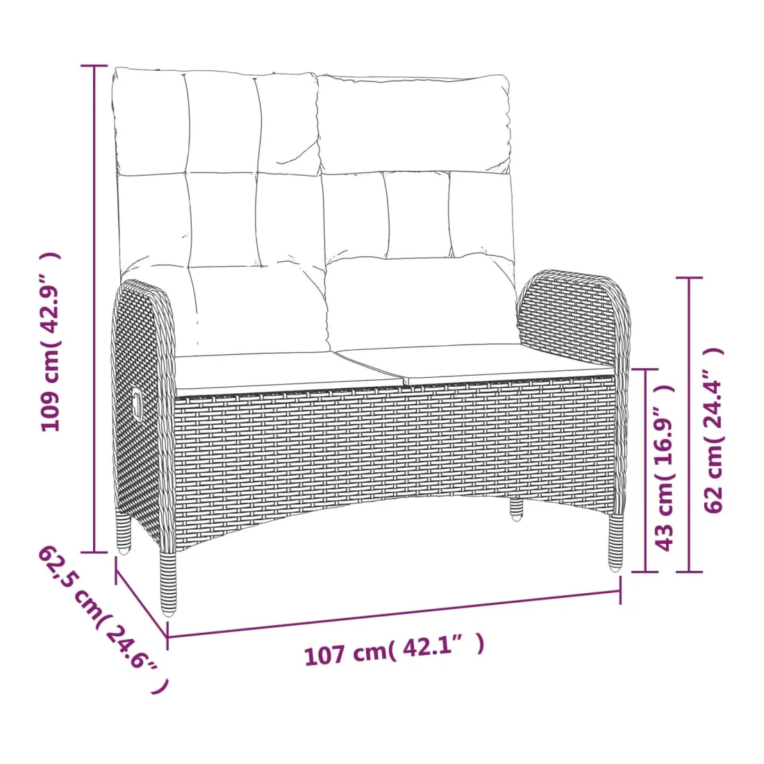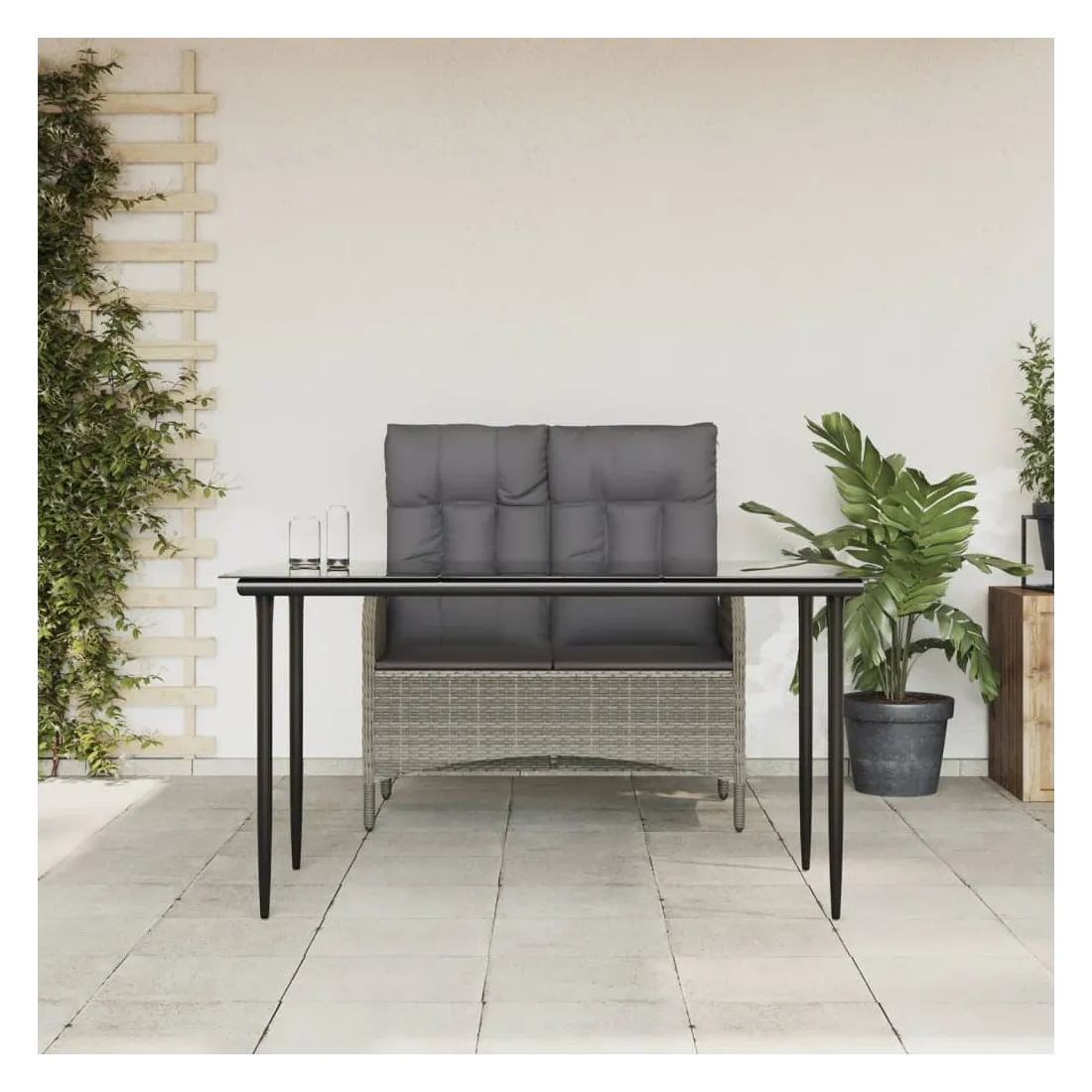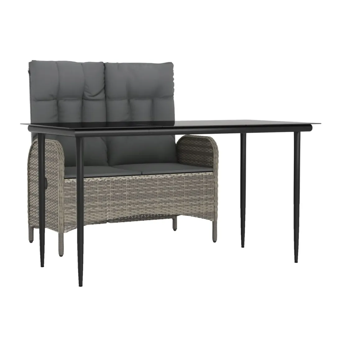 Profitez d'un bon repas ou d'un thé l'après-midi dans votre espace extérieur avec cet ensemble de salle à manger de jardin ! Ayant un design élégant, il deviendra le point central de votre jardin et de votre terrasse ! Matériau haut de gamme : la résine tressée est un matériau de résistance exceptionnelle et durable dans différentes conditions météorologiques.Table pratique : le dessus de table lisse est fabriqué en verre trempé qui est facile à nettoyer avec un chiffon humide. De plus, le dessus de table robuste est parfait pour placer des repas, des boissons et d'autres objets décoratifs.Fonction d'inclinaison : le banc d'extérieur est spécialement conçu avec une fonction d'inclinaison afin que vous puissiez régler le dossier selon votre confort.Expérience d'assise confortable : des coussins supplémentaires sont inclus pour votre confort. Le coussin d'assise et le coussin de dossier peuvent être reliés par une fermeture éclair pour plus de commodité. Bon à savoir :Pour que vos meubles d'extérieur restent beaux, nous vous recommandons de les protéger avec une housse imperméable.