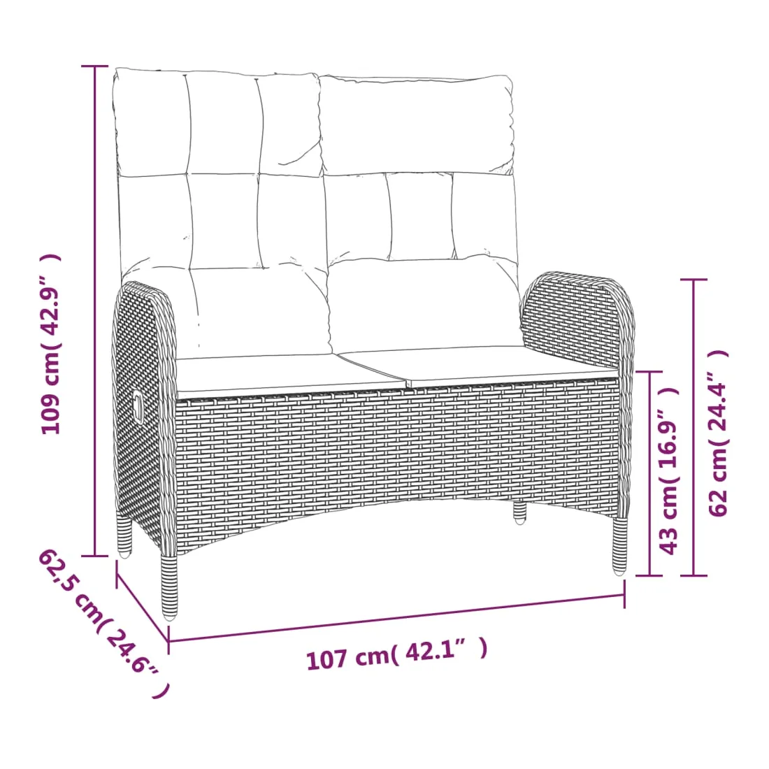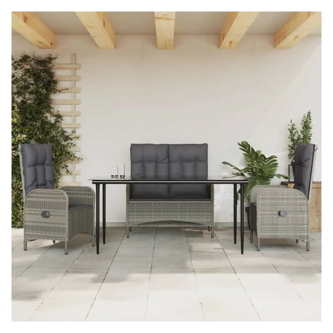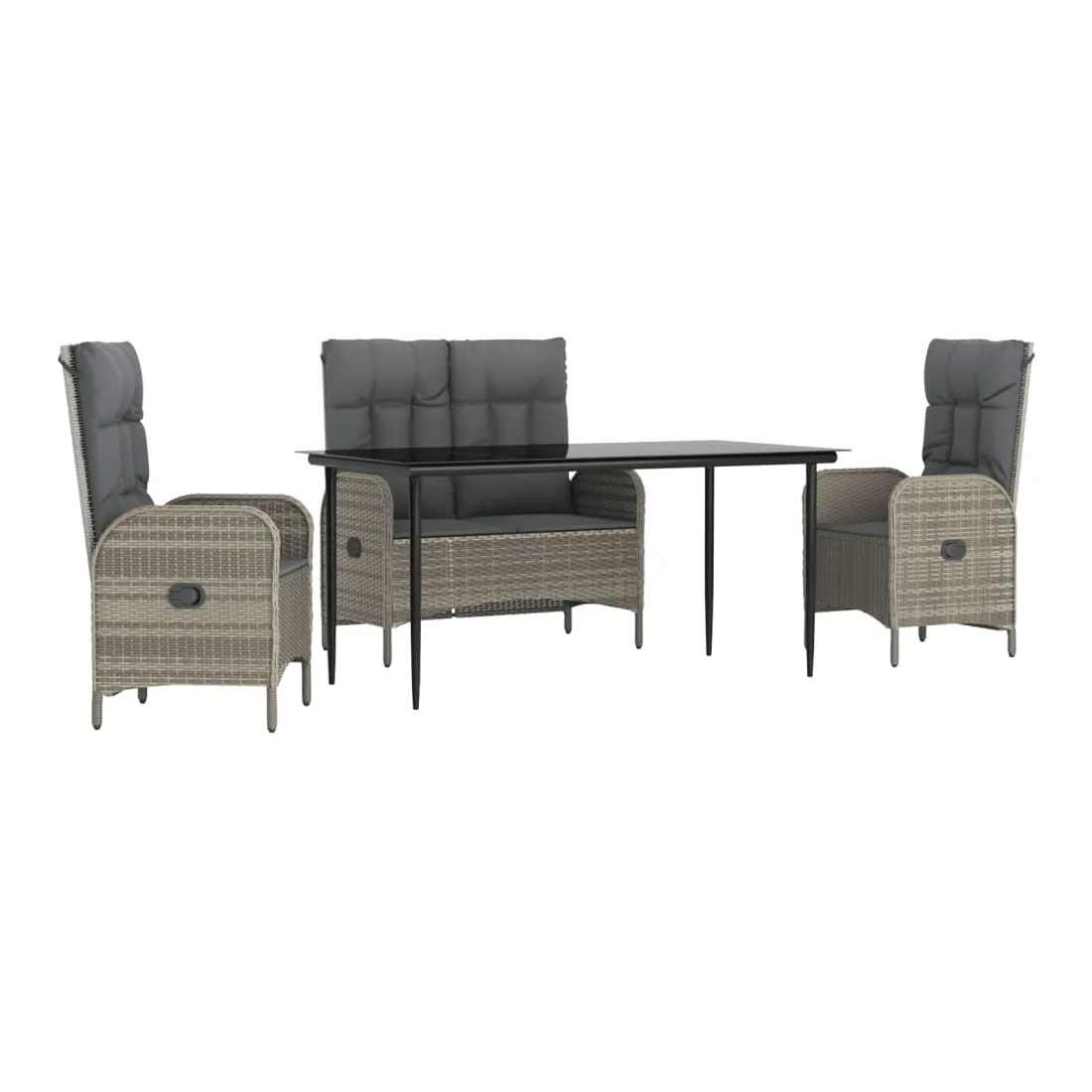 Profitez d'un bon repas ou d'un thé l'après-midi dans votre espace extérieur avec cet ensemble de salle à manger de jardin ! Ayant un design élégant, il deviendra le point central de votre jardin et de votre terrasse ! Matériau haut de gamme : la résine tressée est un matériau de résistance exceptionnelle et durable dans différentes conditions météorologiques.Table pratique : le dessus de table lisse est fabriqué en verre trempé qui est facile à nettoyer avec un chiffon humide. De plus, le dessus de table robuste est parfait pour placer des repas, des boissons et d'autres objets décoratifs.Fonction d'inclinaison : le banc et les chaises d'extérieur sont spécialement conçus avec une fonction d'inclinaison afin que vous puissiez régler le dossier selon votre confort.Expérience d'assise confortable : des coussins supplémentaires sont inclus pour votre confort. Le coussin d'assise et le coussin de dossier peuvent être reliés par une fermeture éclair pour plus de commodité. Bon à savoir :Pour que vos meubles d'extérieur restent beaux, nous vous recommandons de les protéger avec une housse imperméable.
