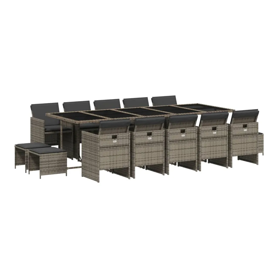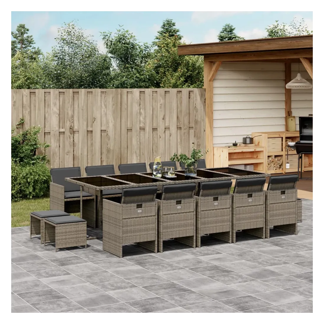 Cet ensemble de salle à manger de jardin est un excellent choix pour les repas en plein air ou pour vous détendre dans le jardin, dans l'arrière-cour ou sur la terrasse. Matériau durable : la résine tressée, également connue sous le nom de poly rotin, est un matériau synthétique solide et nécessitant peu d'entretien qui ressemble au rotin naturel. Il est léger, facile à nettoyer et couramment utilisé pour les meubles d'extérieur en raison de sa durabilité et de ses propriétés de résistance aux intempéries.Rangement compact : ces chaises sont dotées d'un dossier rabattable, ce qui permet de les ranger facilement sous la table. Une fois pliées, elles se rangent parfaitement sous la table, formant un cube peu encombrant. De plus, les tabourets peuvent également être rangés sous les chaises, maximisant encore davantage l'efficacité de l'espace. Expérience d'assise confortable : ce mobilier d'extérieur, doté de coussins épais, offre une expérience d'assise confortable.Housse amovible et lavable : ces coussins de siège sont dotés de housses amovibles pour un lavage et un entretien faciles.Dessus en verre : le dessus de la table d'extérieur est fabriqué en verre trempé solide et durable, ce qui le rend facile à nettoyer avec un chiffon humide et ajoute une touche d'élégance à votre espace extérieur. Bon à savoir : Pour que vos meubles d'extérieur restent beaux, nous vous recommandons de les protéger avec une housse imperméable.