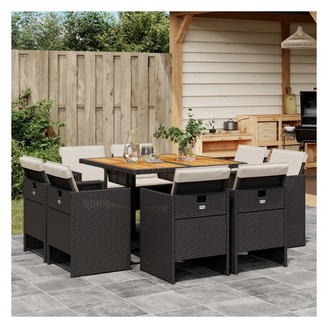 Cet ensemble de salle à manger de jardin est un excellent choix pour les repas en plein air ou pour vous détendre dans le jardin, dans l'arrière-cour ou sur la terrasse. Matériau durable : la résine tressée, également connue sous le nom de poly rotin, est un matériau synthétique solide et nécessitant peu d'entretien qui ressemble au rotin naturel. Il est léger, facile à nettoyer et couramment utilisé pour les meubles d'extérieur en raison de sa durabilité et de ses propriétés de résistance aux intempéries.Rangement compact : ces chaises sont dotées d'un dossier rabattable, ce qui permet de les ranger facilement sous la table. Une fois pliées, elles se rangent parfaitement sous la table, formant un cube peu encombrant. Expérience d'assise confortable : ce mobilier d'extérieur, doté de coussins épais, offre une expérience d'assise confortable.Housse amovible et lavable : ces coussins de siège sont dotés de housses amovibles pour un lavage et un entretien faciles.Dessus stable et facile à nettoyer : cette table de jardin a un dessus en bois d'acacia robuste, durable et facile à nettoyer avec un chiffon humide. Bon à savoir : Pour que vos meubles d'extérieur restent beaux, nous vous recommandons de les protéger avec une housse imperméable.
