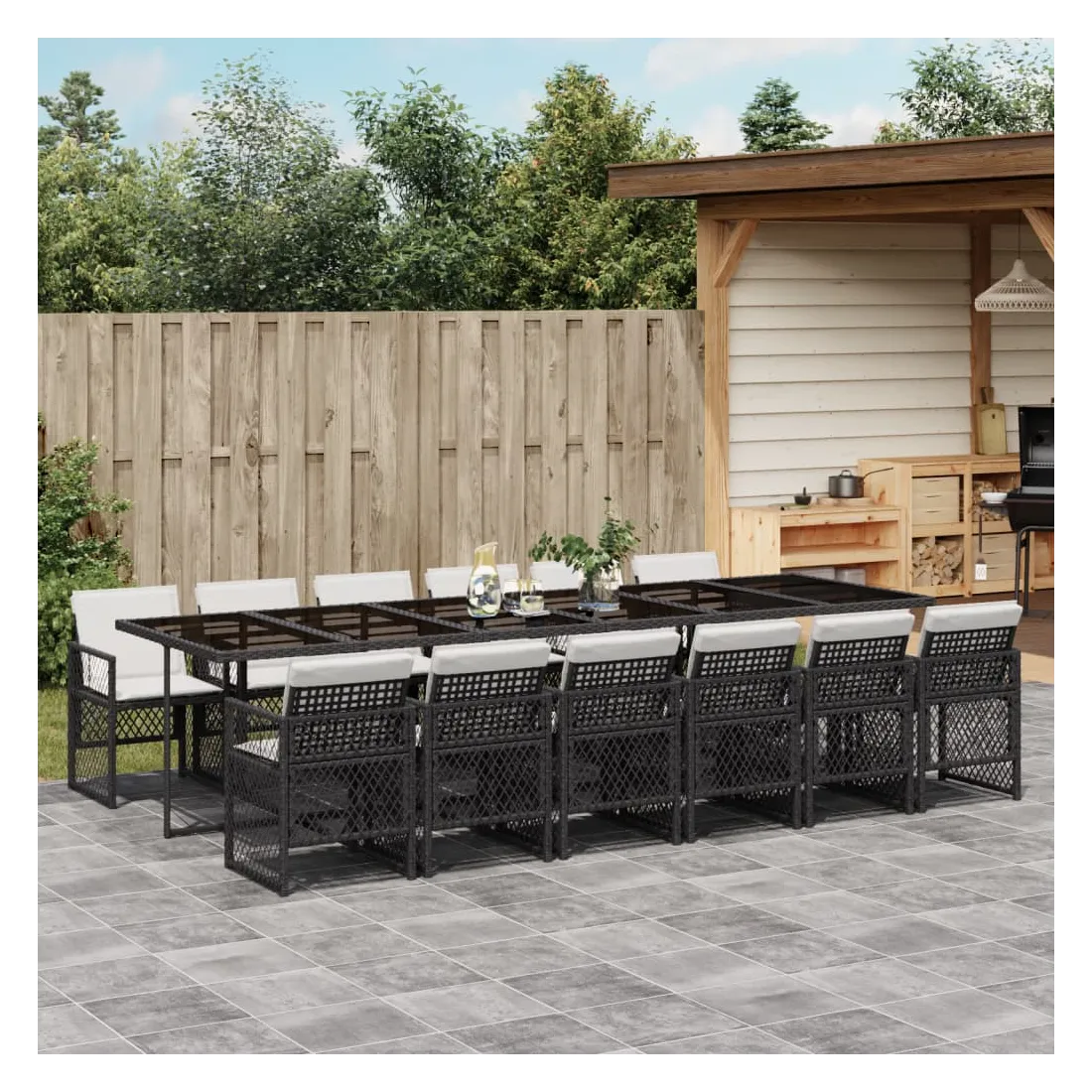 Cet ensemble de salle à manger de jardin est un excellent choix pour les repas en plein air ou pour vous détendre dans le jardin, l'arrière-cour ou le patio. Matériau durable : la résine tressée, également connue sous le nom de poly rotin, est un matériau synthétique solide et nécessitant peu d'entretien qui ressemble au rotin naturel. Elle est légère, facile à nettoyer et couramment utilisée pour les meubles d'extérieur en raison de sa durabilité et de ses propriétés de résistance aux intempéries. Dessus en verre : le dessus de la table d'extérieur est fabriqué en verre trempé solide et durable, ce qui le rend facile à nettoyer avec un chiffon humide et ajoute une touche d'élégance à votre espace extérieur. Rangement compact : ces chaises sont dotées d'un dossier rabattable, ce qui permet de les ranger facilement sous la table. Une fois pliées, elles se rangent parfaitement sous la table, formant un cube peu encombrant. Expérience d'assise confortable : ce mobilier d'extérieur, doté de coussins épais, offre une expérience d'assise confortable. Housse amovible et lavable : ces coussins de siège sont dotés de housses amovibles pour un lavage et un entretien faciles. Les housses de coussin de chaise ont un rabat à l'arrière pour une fixation facile aux chaises. Bon à savoir :Pour que vos meubles d'extérieur restent beaux, nous vous recommandons de les protéger avec une housse imperméable.