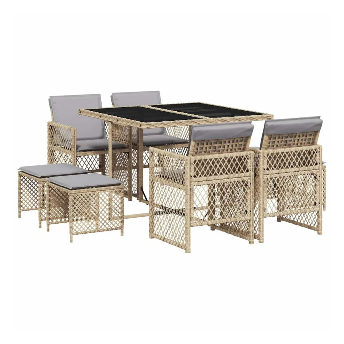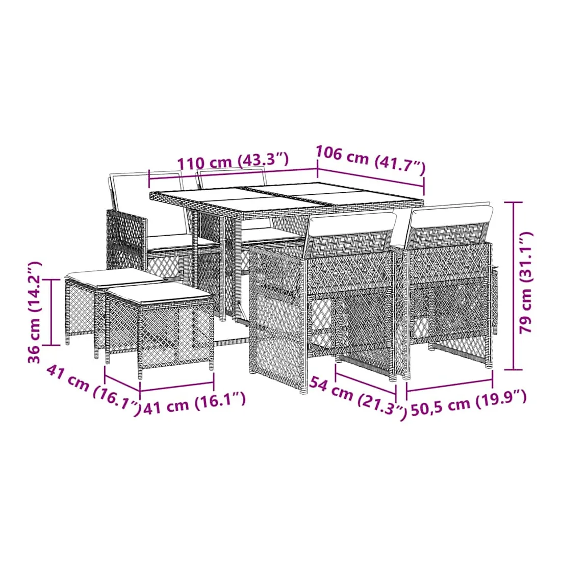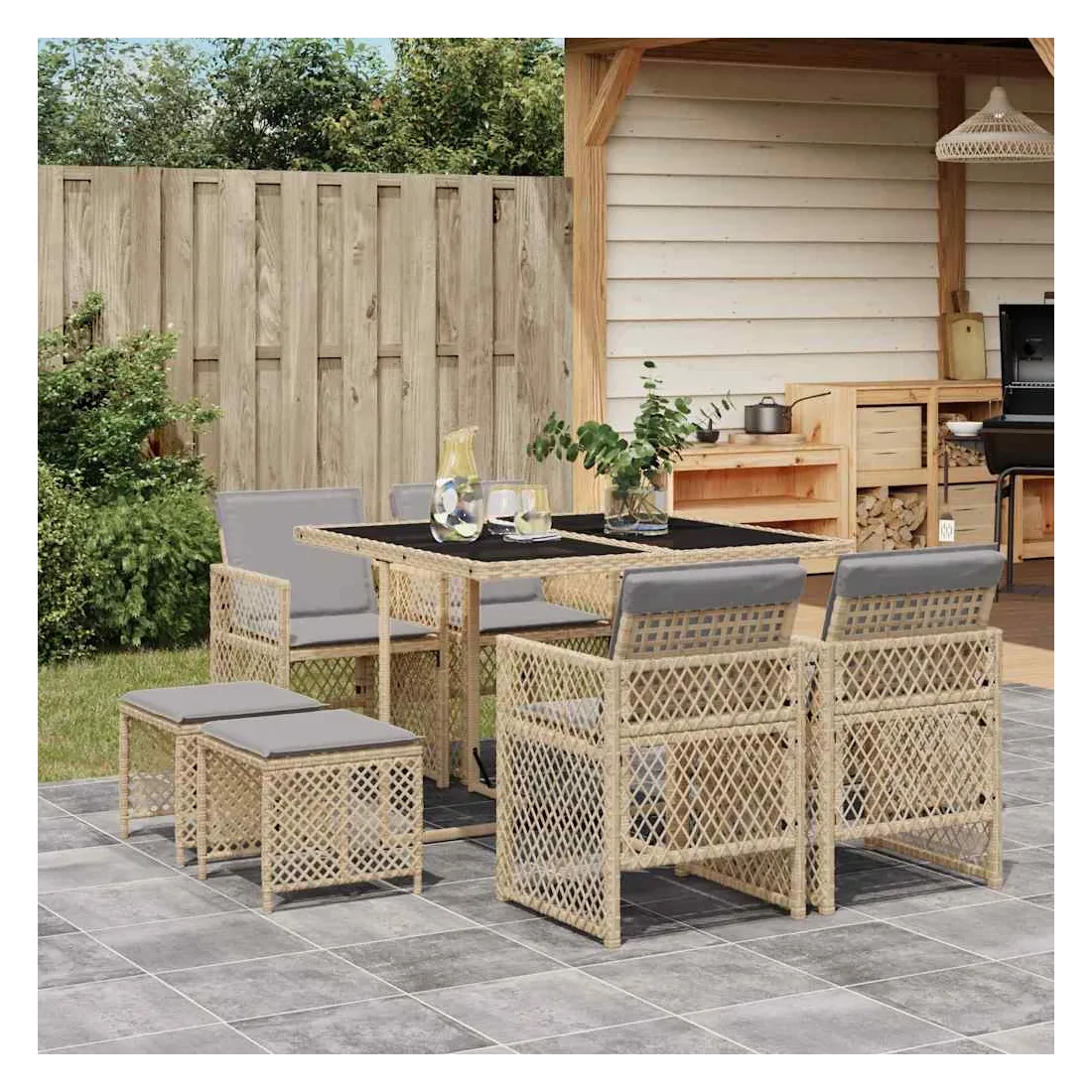 Cet ensemble de salle à manger de jardin est un excellent choix pour les repas en plein air ou pour vous détendre dans le jardin, l'arrière-cour ou le patio. Matériau durable : la résine tressée, également connue sous le nom de poly rotin, est un matériau synthétique solide et nécessitant peu d'entretien qui ressemble au rotin naturel. Elle est légère, facile à nettoyer et couramment utilisée pour les meubles d'extérieur en raison de sa durabilité et de ses propriétés de résistance aux intempéries. Dessus en verre : le dessus de la table d'extérieur est fabriqué en verre trempé solide et durable, ce qui le rend facile à nettoyer avec un chiffon humide et ajoute une touche d'élégance à votre espace extérieur. Rangement compact : ces chaises sont dotées d'un dossier rabattable, ce qui permet de les ranger facilement sous la table. Une fois pliées, elles se rangent parfaitement sous la table, formant un cube peu encombrant. De plus, les tabourets peuvent également être rangés sous les chaises, maximisant encore davantage l'efficacité de l'espace. Expérience d'assise confortable : ce mobilier d'extérieur, doté de coussins épais, offre une expérience d'assise confortable. Housse amovible et lavable : ces coussins de siège sont dotés de housses amovibles pour un lavage et un entretien faciles. Les housses de coussin de chaise ont un rabat à l'arrière pour une fixation facile aux chaises. Bon à savoir :Pour que vos meubles d'extérieur restent beaux, nous vous recommandons de les protéger avec une housse imperméable.