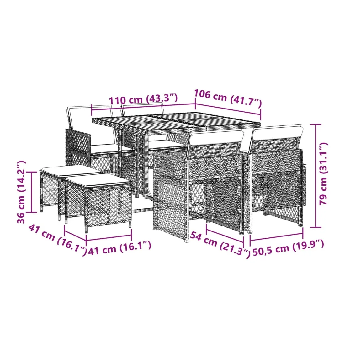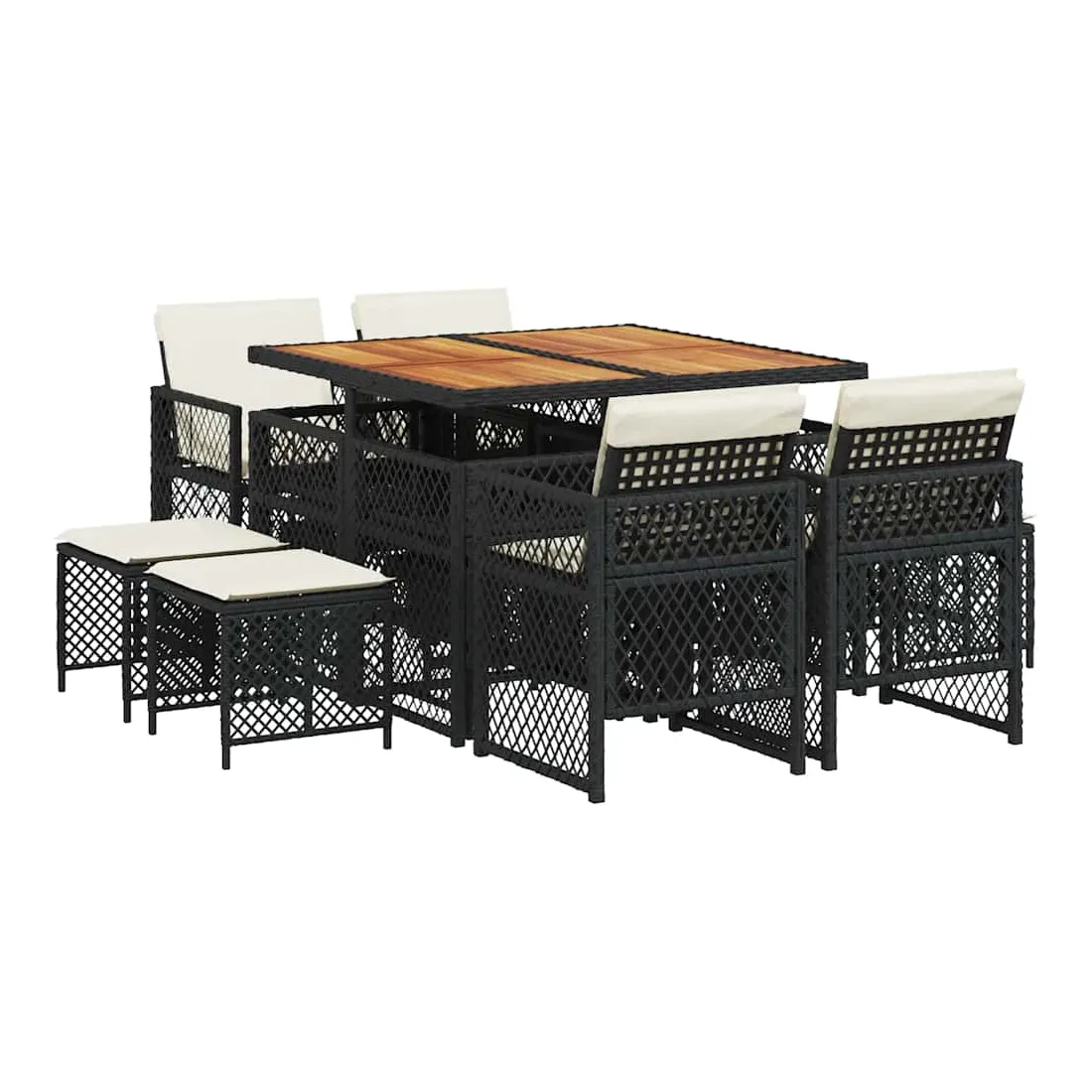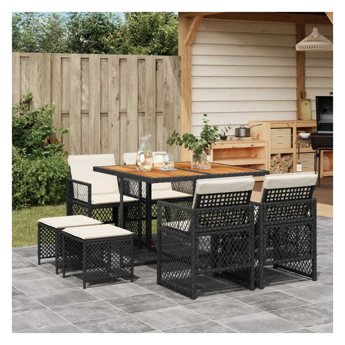 Cet ensemble de salle à manger de jardin est un excellent choix pour les repas en plein air ou pour vous détendre dans le jardin, l'arrière-cour ou le patio. Matériau durable : la résine tressée, également connue sous le nom de poly rotin, est un matériau synthétique solide et nécessitant peu d'entretien qui ressemble au rotin naturel. Elle est légère, facile à nettoyer et couramment utilisée pour les meubles d'extérieur en raison de sa durabilité et de ses propriétés de résistance aux intempéries. Dessus stable et facile à nettoyer : cette table de jardin a un dessus en bois d'acacia robuste, durable et facile à nettoyer avec un chiffon humide. Rangement compact : ces chaises sont dotées d'un dossier rabattable, ce qui permet de les ranger facilement sous la table. Une fois pliées, elles se rangent parfaitement sous la table, formant un cube peu encombrant. De plus, les tabourets peuvent également être rangés sous les chaises, maximisant encore davantage l'efficacité de l'espace. Expérience d'assise confortable : ce mobilier d'extérieur, doté de coussins épais, offre une expérience d'assise confortable. Housse amovible et lavable : ces coussins de siège sont dotés de housses amovibles pour un lavage et un entretien faciles. Les housses de coussin de chaise ont un rabat à l'arrière pour une fixation facile aux chaises. Bon à savoir :Pour que vos meubles d'extérieur restent beaux, nous vous recommandons de les protéger avec une housse imperméable.
