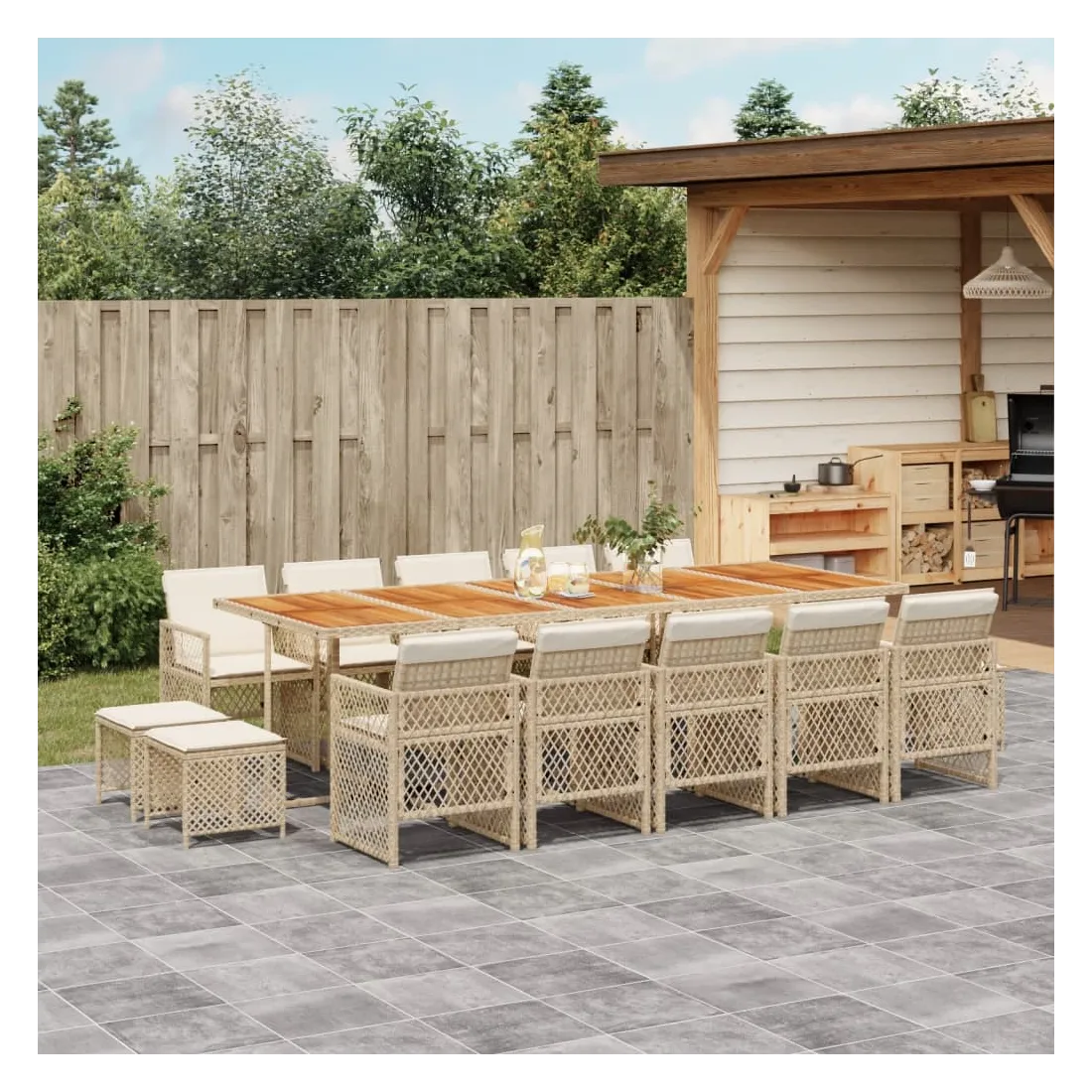 Cet ensemble de salle à manger de jardin est un excellent choix pour les repas en plein air ou pour vous détendre dans le jardin, l'arrière-cour ou le patio. Matériau durable : la résine tressée, également connue sous le nom de poly rotin, est un matériau synthétique solide et nécessitant peu d'entretien qui ressemble au rotin naturel. Elle est légère, facile à nettoyer et couramment utilisée pour les meubles d'extérieur en raison de sa durabilité et de ses propriétés de résistance aux intempéries. Dessus stable et facile à nettoyer : cette table de jardin a un dessus en bois d'acacia robuste, durable et facile à nettoyer avec un chiffon humide. Rangement compact : ces chaises sont dotées d'un dossier rabattable, ce qui permet de les ranger facilement sous la table. Une fois pliées, elles se rangent parfaitement sous la table, formant un cube peu encombrant. De plus, les tabourets peuvent également être rangés sous les chaises, maximisant encore davantage l'efficacité de l'espace. Expérience d'assise confortable : ce mobilier d'extérieur, doté de coussins épais, offre une expérience d'assise confortable. Housse amovible et lavable : ces coussins de siège sont dotés de housses amovibles pour un lavage et un entretien faciles. Les housses de coussin de chaise ont un rabat à l'arrière pour une fixation facile aux chaises. Bon à savoir :Pour que vos meubles d'extérieur restent beaux, nous vous recommandons de les protéger avec une housse imperméable.