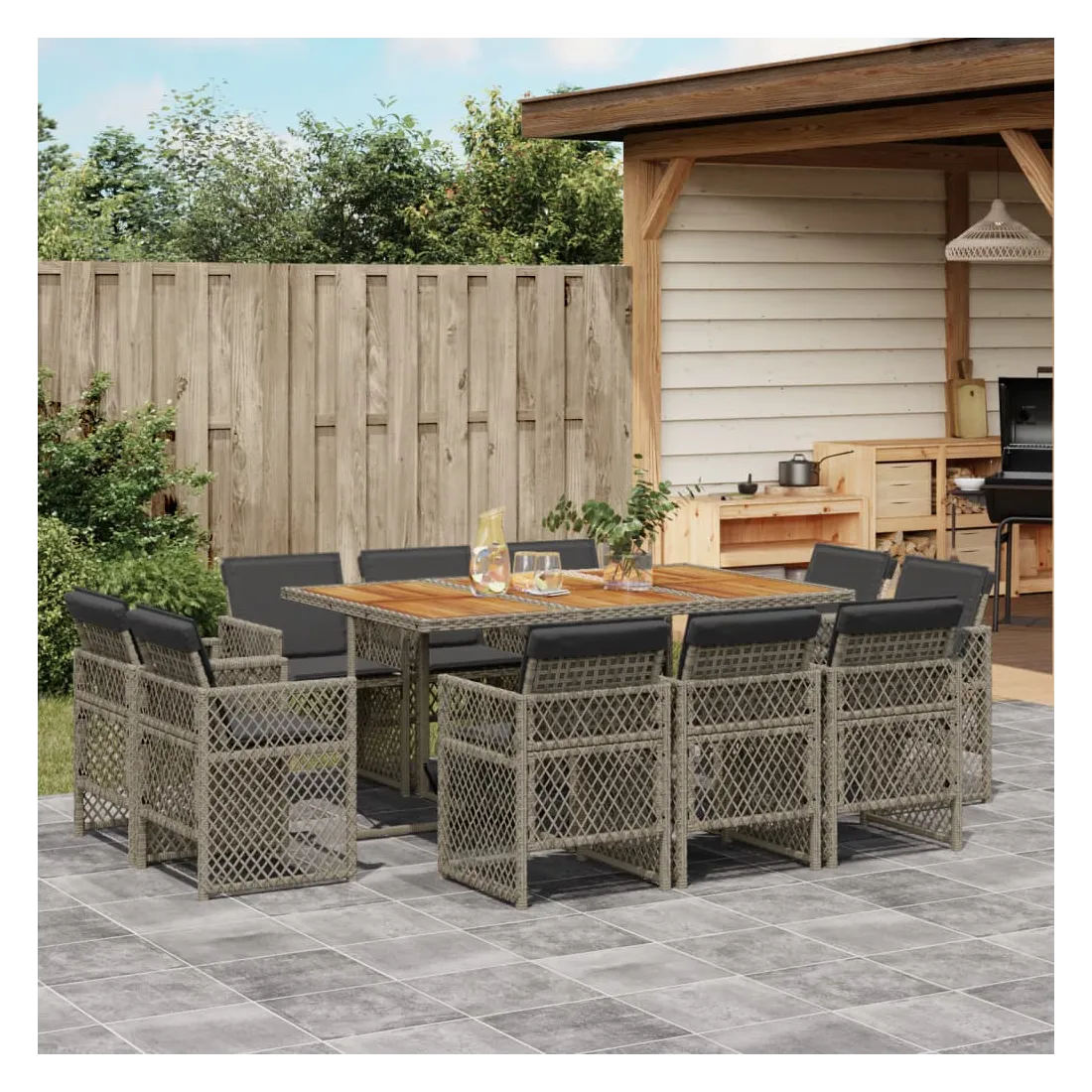Cet ensemble de salle à manger de jardin est un excellent choix pour les repas en plein air ou pour vous détendre dans le jardin, dans l'arrière-cour ou sur la terrasse. Matériau durable : la résine tressée, également connue sous le nom de poly rotin, est un matériau synthétique solide et nécessitant peu d'entretien qui ressemble au rotin naturel. Elle est légère, facile à nettoyer et couramment utilisée pour les meubles d'extérieur en raison de sa durabilité et de ses propriétés de résistance aux intempéries.Rangement compact : ces chaises sont dotées d'un dossier à rabat qui peut être rabattu pour un rangement compact.Expérience d'assise confortable : ce mobilier d'extérieur, doté de coussins épais, offre une expérience d'assise confortable.Housse amovible et lavable : ces coussins de siège sont dotés de housses amovibles pour un lavage et un entretien faciles. Les housses de coussin de chaise ont un rabat à l'arrière pour une fixation facile aux chaises.Dessus stable et facile à nettoyer : cette table de jardin a un dessus en bois d'acacia robuste, durable et facile à nettoyer avec un chiffon humide. Bon à savoir : Pour que vos meubles d'extérieur restent beaux, nous vous recommandons de les protéger avec une housse imperméable.