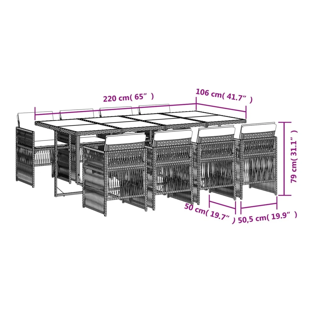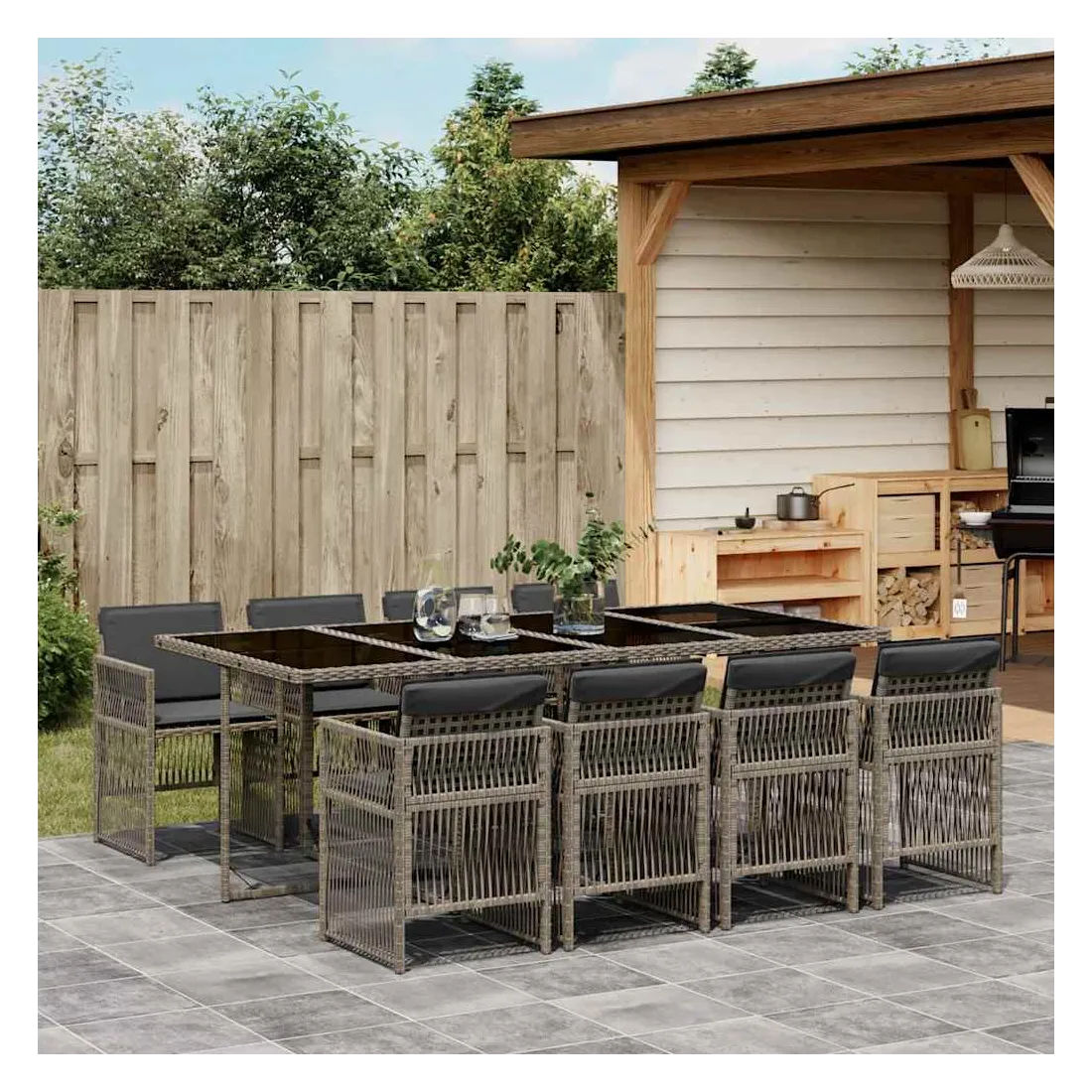 Cet ensemble de salle à manger de jardin est un excellent choix pour les repas en plein air ou pour vous détendre dans le jardin, dans l'arrière-cour ou sur la terrasse. Matériau durable : la résine tressée, également connue sous le nom de poly rotin, est un matériau synthétique solide et nécessitant peu d'entretien qui ressemble au rotin naturel. Il est léger, facile à nettoyer et couramment utilisé pour les meubles d'extérieur en raison de sa durabilité et de ses propriétés de résistance aux intempéries.Rangement compact : ces chaises sont dotées d'un dossier rabattable, ce qui permet de les ranger facilement sous la table. Une fois pliées, elles se rangent parfaitement sous la table, formant un cube peu encombrant.Expérience d'assise confortable : ce mobilier d'extérieur, doté de coussins épais, offre une expérience d'assise confortable.Housse amovible et lavable : ces coussins sont dotés de housses amovibles pour un lavage et un entretien faciles. Les housses de coussin ont un rabat à l'arrière pour une fixation facile aux dossiers.Dessus en verre : le dessus de la table d'extérieur est fabriqué en verre trempé solide et durable, ce qui le rend facile à nettoyer avec un chiffon humide et ajoute une touche d'élégance à votre espace extérieur. Bon à savoir : Pour que vos meubles d'extérieur restent beaux, nous vous recommandons de les protéger avec une housse imperméable.