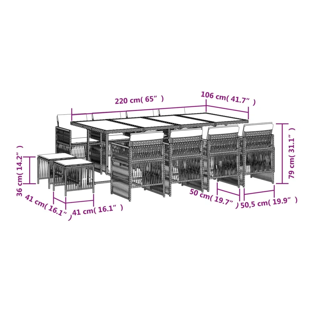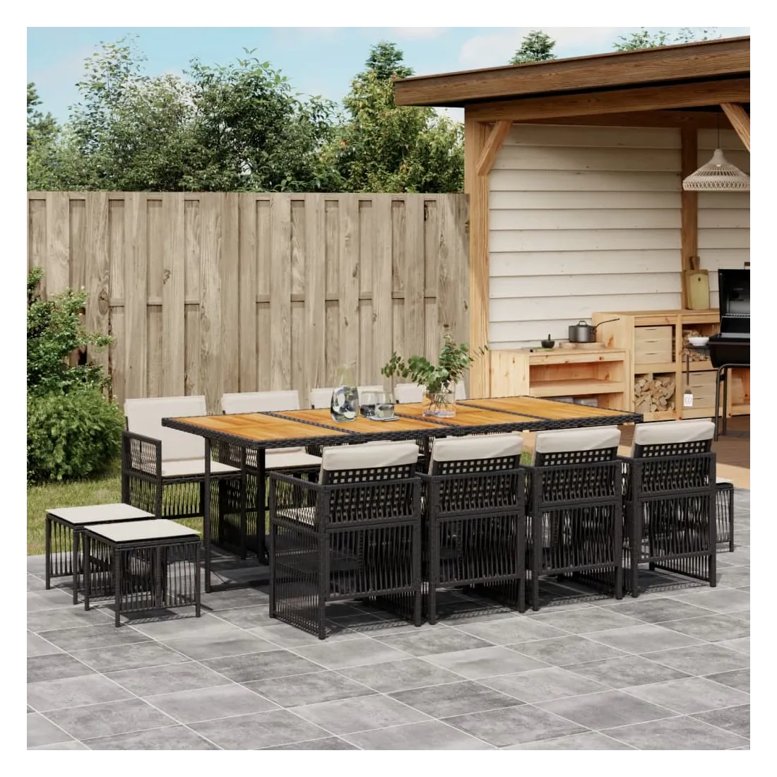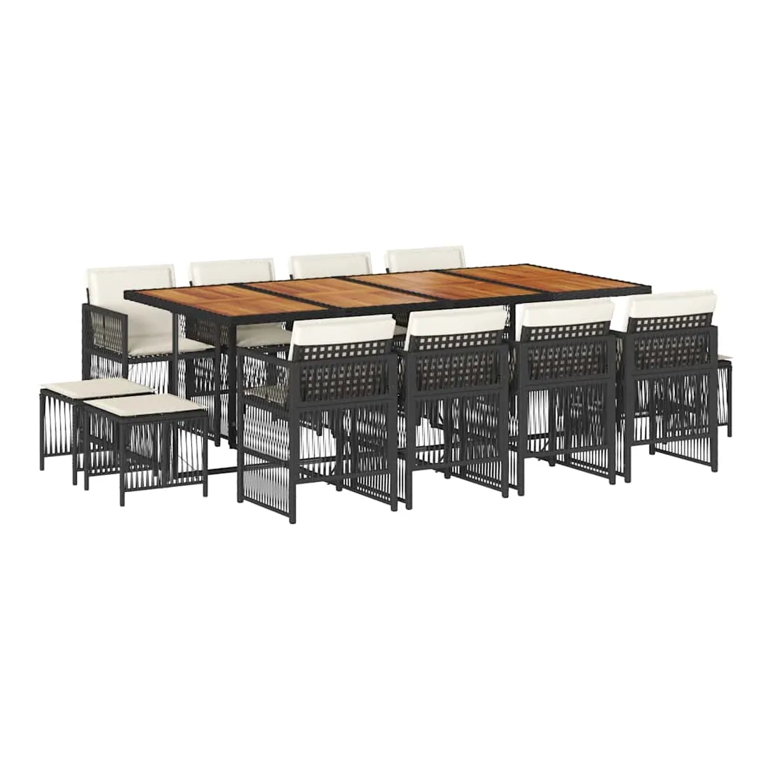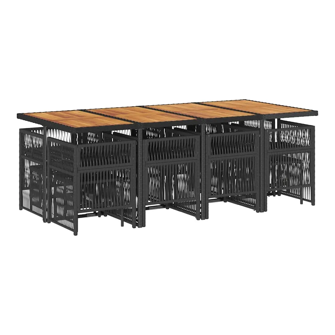 Cet ensemble de salle à manger de jardin est un excellent choix pour les repas en plein air ou pour vous détendre dans le jardin, dans l'arrière-cour ou sur la terrasse. Matériau durable : la résine tressée, également connue sous le nom de poly rotin, est un matériau synthétique solide et nécessitant peu d'entretien qui ressemble au rotin naturel. Il est léger, facile à nettoyer et couramment utilisé pour les meubles d'extérieur en raison de sa durabilité et de ses propriétés de résistance aux intempéries.Rangement compact : ces chaises sont dotées d'un dossier rabattable, ce qui permet de les ranger facilement sous la table. Une fois pliées, elles se rangent parfaitement sous la table, formant un cube peu encombrant. De plus, les tabourets peuvent également être rangés sous les chaises, maximisant encore davantage l'efficacité de l'espace.Expérience d'assise confortable : ce mobilier d'extérieur, doté de coussins épais, offre une expérience d'assise confortable.Housse amovible et lavable : ces coussins sont dotés de housses amovibles pour un lavage et un entretien faciles. Les housses de coussin ont un rabat à l'arrière pour une fixation facile aux dossiers.Dessus stable et facile à nettoyer : cette table de jardin a un dessus en bois d'acacia robuste, durable et facile à nettoyer avec un chiffon humide. Bon à savoir : Pour que vos meubles d'extérieur restent beaux, nous vous recommandons de les protéger avec une housse imperméable.