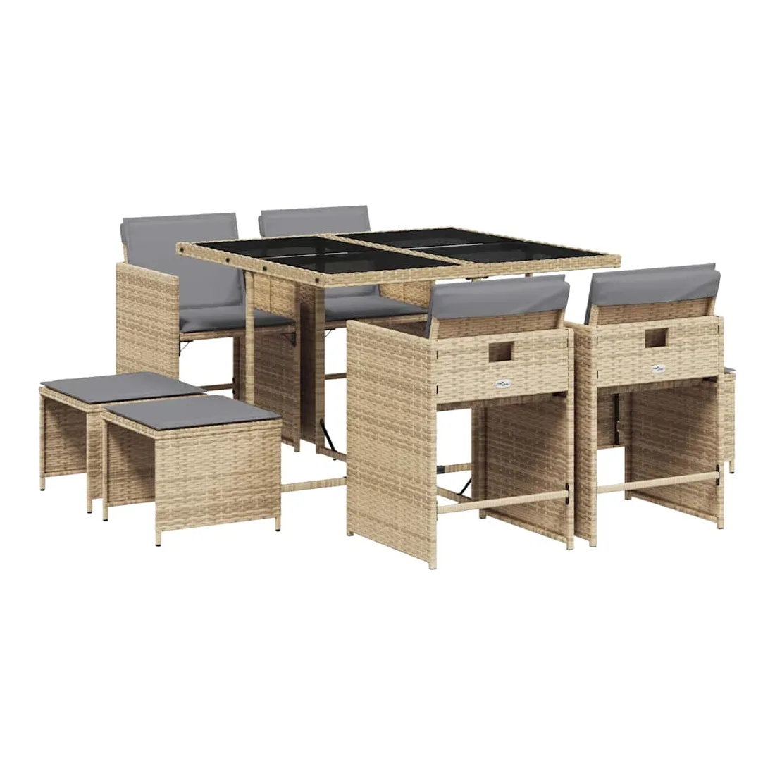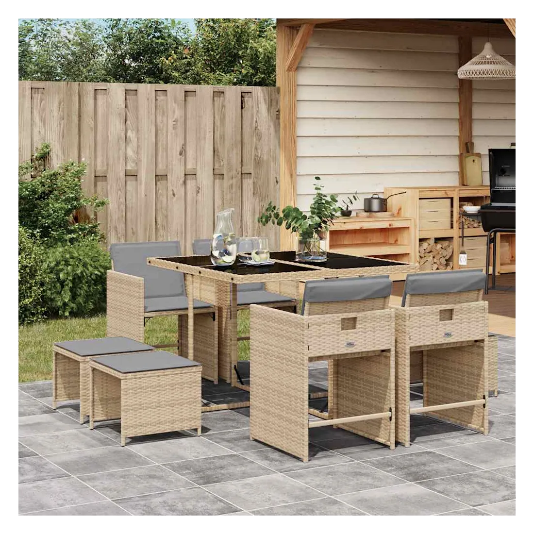 Cet ensemble de salle à manger de jardin est un excellent choix pour les repas en plein air ou pour vous détendre dans le jardin, dans l'arrière-cour ou sur la terrasse. Matériau durable : la résine tressée, également connue sous le nom de poly rotin, est un matériau synthétique solide et nécessitant peu d'entretien qui ressemble au rotin naturel. Il est léger, facile à nettoyer et couramment utilisé pour les meubles d'extérieur en raison de sa durabilité et de ses propriétés de résistance aux intempéries.Rangement compact : ces chaises sont dotées d'un dossier rabattable, ce qui permet de les ranger facilement sous la table. Une fois pliées, elles se rangent parfaitement sous la table, formant un cube peu encombrant. De plus, les tabourets peuvent également être rangés sous les chaises, maximisant encore davantage l'efficacité de l'espace.Expérience d'assise confortable : ce mobilier d'extérieur, doté de coussins bien rembourrés, offre une expérience d'assise confortable.Housse amovible et lavable : ces coussins de siège sont dotés de housses amovibles pour un lavage et un entretien faciles. Les housses de coussin de chaise ont un rabat à l'arrière pour une fixation facile aux chaises.Dessus stable et facile à nettoyer : cette table de jardin est dotée d'un dessus en verre trempé robuste, durable et facile à nettoyer à l'aide d'un chiffon humide. Bon à savoir : Pour que vos meubles d'extérieur restent beaux, nous vous recommandons de les protéger avec une housse imperméable.