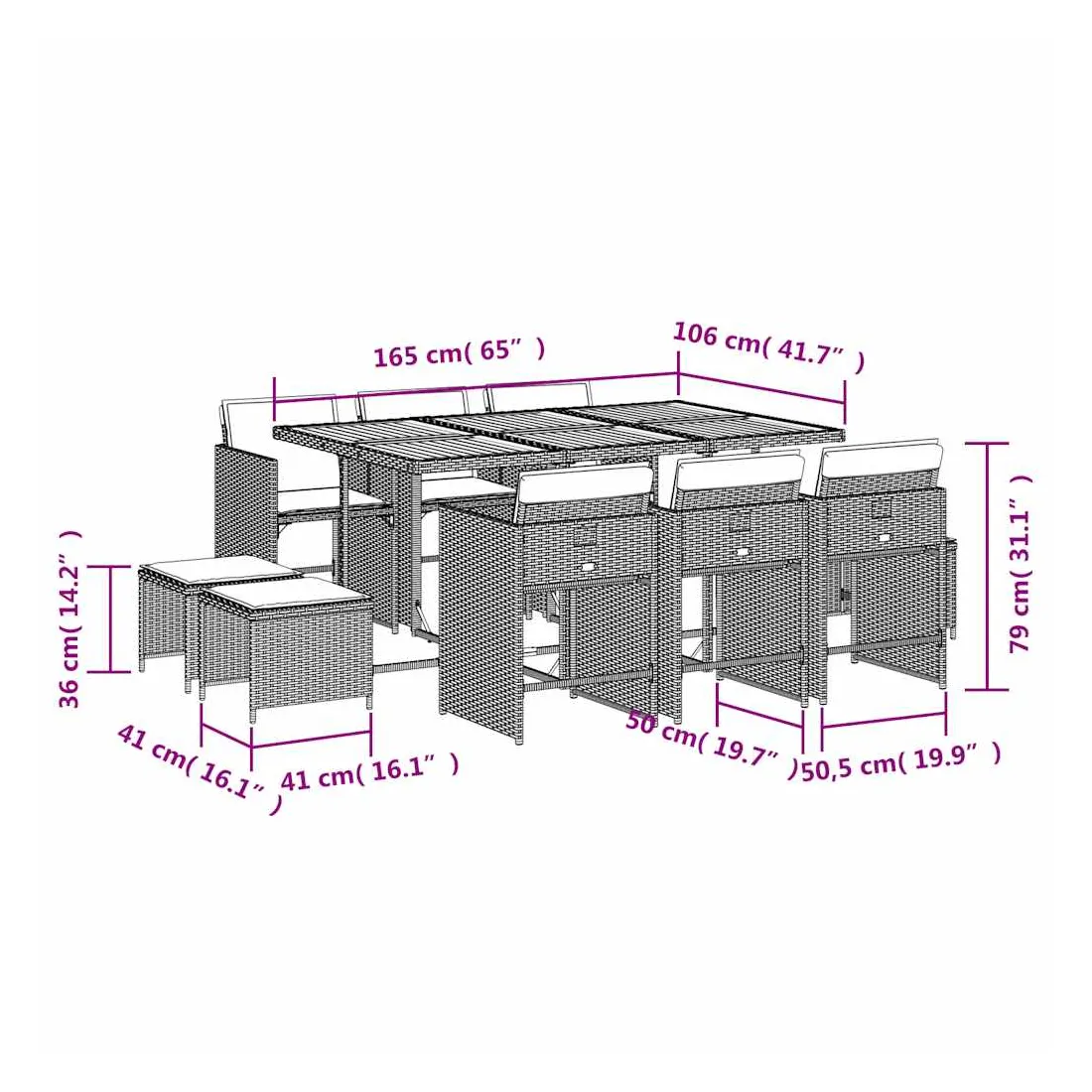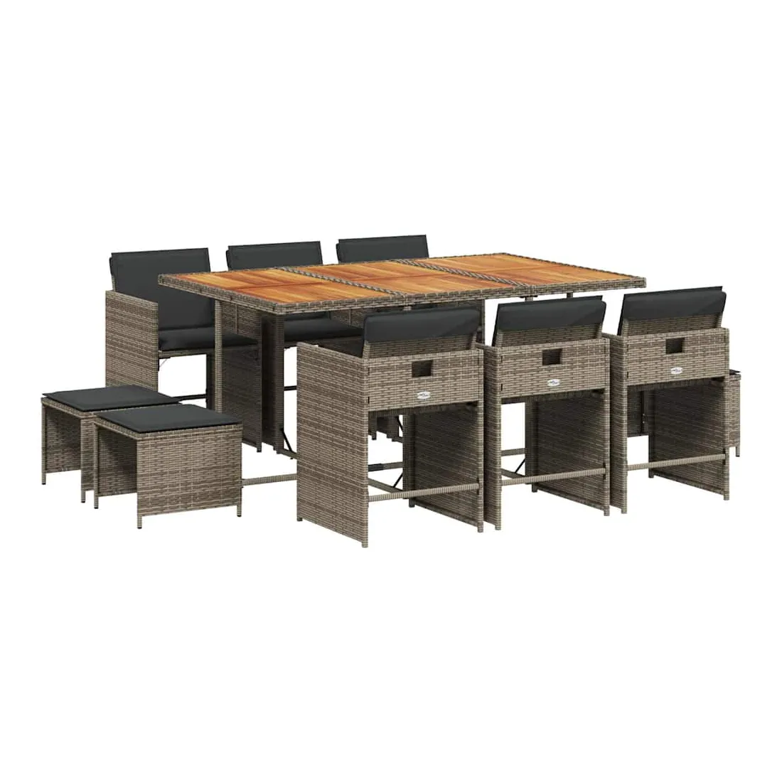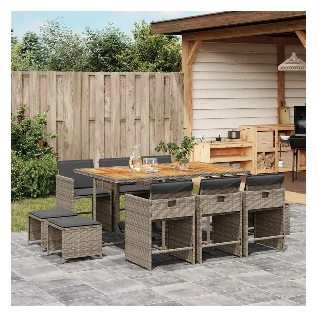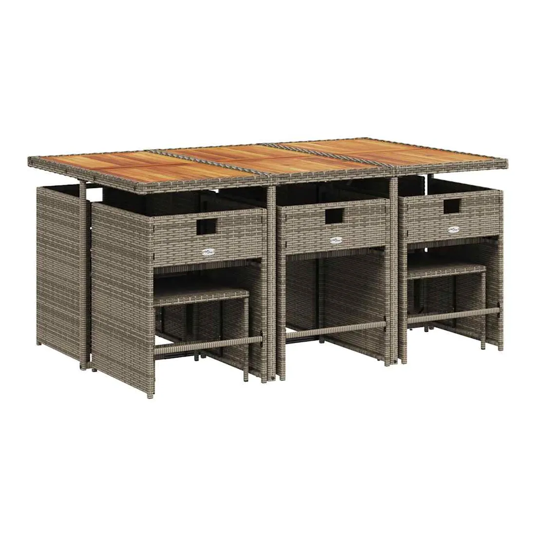 Cet ensemble de salle à manger de jardin est un excellent choix pour les repas en plein air ou pour vous détendre dans le jardin, dans l'arrière-cour ou sur la terrasse. Matériau durable : la résine tressée, également connue sous le nom de poly rotin, est un matériau synthétique solide et nécessitant peu d'entretien qui ressemble au rotin naturel. Il est léger, facile à nettoyer et couramment utilisé pour les meubles d'extérieur en raison de sa durabilité et de ses propriétés de résistance aux intempéries.Rangement compact : ces chaises sont dotées d'un dossier rabattable, ce qui permet de les ranger facilement sous la table. Une fois pliées, elles se rangent parfaitement sous la table, formant un cube peu encombrant. De plus, les tabourets peuvent également être rangés sous les chaises, maximisant encore davantage l'efficacité de l'espace.Expérience d'assise confortable : ce mobilier d'extérieur, doté de coussins épais, offre une expérience d'assise confortable.Housse amovible et lavable : ces coussins de siège sont dotés de housses amovibles pour un lavage et un entretien faciles. Les housses de coussin de chaise ont un rabat à l'arrière pour une fixation facile aux chaises.Dessus stable et facile à nettoyer : cette table de jardin a un dessus en bois d'acacia robuste, durable et facile à nettoyer avec un chiffon humide. Bon à savoir : Pour que vos meubles d'extérieur restent beaux, nous vous recommandons de les protéger avec une housse imperméable.