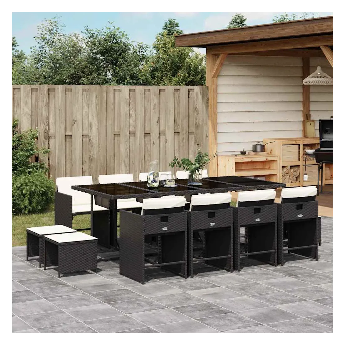 Cet ensemble de salle à manger de jardin est un excellent choix pour les repas en plein air ou pour vous détendre dans le jardin, dans l'arrière-cour ou sur la terrasse. Matériau durable : la résine tressée, également connue sous le nom de poly rotin, est un matériau synthétique solide et nécessitant peu d'entretien qui ressemble au rotin naturel. Il est léger, facile à nettoyer et couramment utilisé pour les meubles d'extérieur en raison de sa durabilité et de ses propriétés de résistance aux intempéries.Rangement compact : ces chaises sont dotées d'un dossier rabattable, ce qui permet de les ranger facilement sous la table. Une fois pliées, elles se rangent parfaitement sous la table, formant un cube peu encombrant. De plus, les tabourets peuvent également être rangés sous les chaises, maximisant encore davantage l'efficacité de l'espace.Expérience d'assise confortable : ce mobilier d'extérieur, doté de coussins épais, offre une expérience d'assise confortable.Housse amovible et lavable : ces coussins de siège sont dotés de housses amovibles pour un lavage et un entretien faciles. Les housses de coussin de chaise ont un rabat à l'arrière pour une fixation facile aux chaises.Dessus stable et facile à nettoyer : cette table de jardin est dotée d'un dessus en verre trempé robuste, durable et facile à nettoyer à l'aide d'un chiffon humide. Bon à savoir : Pour que vos meubles d'extérieur restent beaux, nous vous recommandons de les protéger avec une housse imperméable.