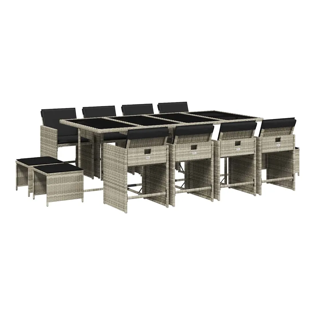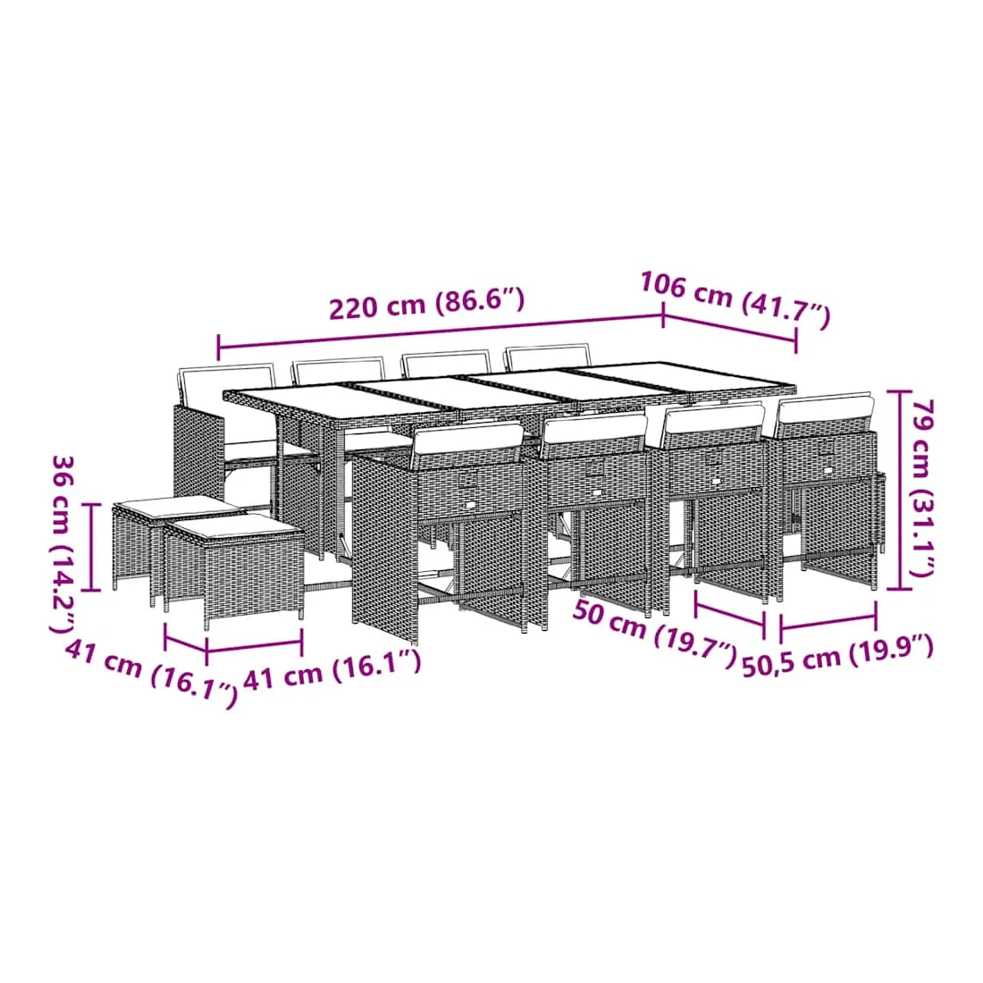 Cet ensemble de salle à manger de jardin est un excellent choix pour les repas en plein air ou pour vous détendre dans le jardin, dans l'arrière-cour ou sur la terrasse. Matériau durable : la résine tressée, également connue sous le nom de poly rotin, est un matériau synthétique solide et nécessitant peu d'entretien qui ressemble au rotin naturel. Il est léger, facile à nettoyer et couramment utilisé pour les meubles d'extérieur en raison de sa durabilité et de ses propriétés de résistance aux intempéries.Rangement compact : ces chaises sont dotées d'un dossier rabattable, ce qui permet de les ranger facilement sous la table. Une fois pliées, elles se rangent parfaitement sous la table, formant un cube peu encombrant. De plus, les tabourets peuvent également être rangés sous les chaises, maximisant encore davantage l'efficacité de l'espace.Expérience d'assise confortable : ce mobilier d'extérieur, doté de coussins épais, offre une expérience d'assise confortable.Housse amovible et lavable : ces coussins de siège sont dotés de housses amovibles pour un lavage et un entretien faciles. Les housses de coussin de chaise ont un rabat à l'arrière pour une fixation facile aux chaises.Dessus stable et facile à nettoyer : cette table de jardin est dotée d'un dessus en verre trempé robuste, durable et facile à nettoyer à l'aide d'un chiffon humide. Bon à savoir : Pour que vos meubles d'extérieur restent beaux, nous vous recommandons de les protéger avec une housse imperméable.