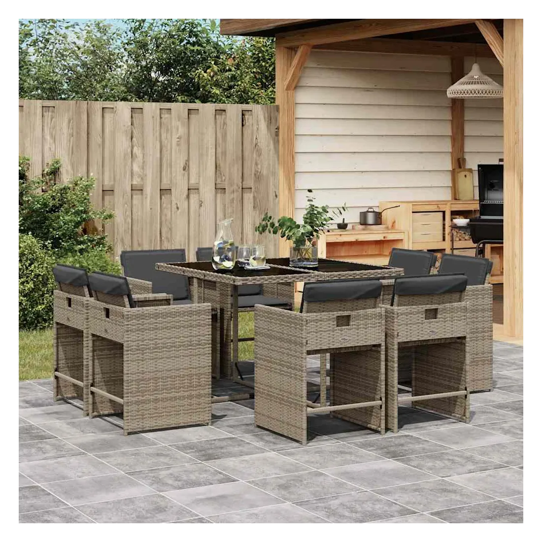 Cet ensemble de salle à manger de jardin est un excellent choix pour les repas en plein air ou pour vous détendre dans le jardin, dans l'arrière-cour ou sur la terrasse. Matériau durable : la résine tressée, également connue sous le nom de poly rotin, est un matériau synthétique solide et nécessitant peu d'entretien qui ressemble au rotin naturel. Il est léger, facile à nettoyer et couramment utilisé pour les meubles d'extérieur en raison de sa durabilité et de ses propriétés de résistance aux intempéries.Rangement compact : ces chaises sont dotées d'un dossier rabattable, ce qui permet de les ranger facilement sous la table. Une fois pliées, elles se rangent parfaitement sous la table, formant un cube peu encombrant.Expérience d'assise confortable : ce mobilier d'extérieur, doté de coussins épais, offre une expérience d'assise confortable.Housse amovible et lavable : ces coussins de siège sont dotés de housses amovibles pour un lavage et un entretien faciles. Les housses de coussin de chaise ont un rabat à l'arrière pour une fixation facile aux chaises.Dessus stable et facile à nettoyer : cette table de jardin est dotée d'un dessus en verre trempé robuste, durable et facile à nettoyer à l'aide d'un chiffon humide. Bon à savoir : Pour que vos meubles d'extérieur restent beaux, nous vous recommandons de les protéger avec une housse imperméable.